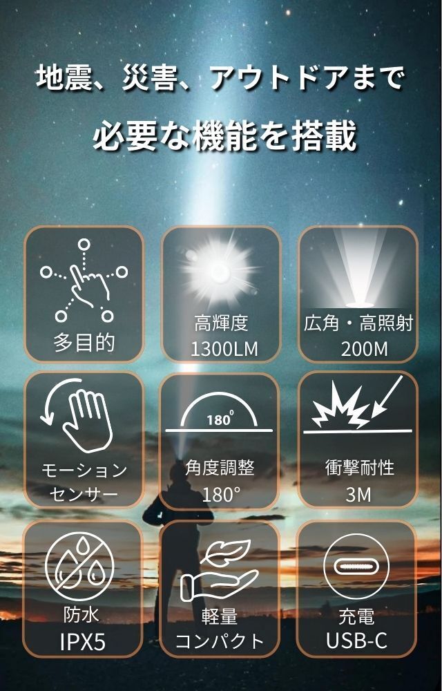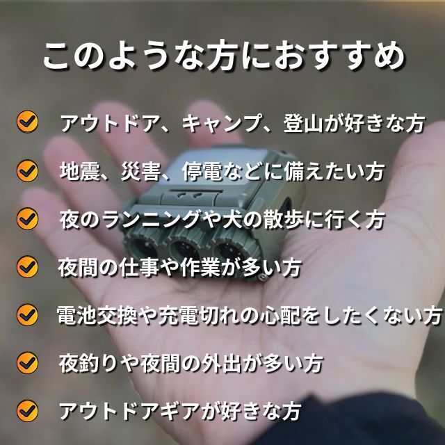 登山中や作業中に手袋を付けていたり操作ボタンが押せない場合、センサー前約10㎝以内に手をサッとかざすだけでライトが点灯させることが出来るので大変役に立ちます。また寝室の枕元に常備して急な停電や地震などに備えたり、防犯センサーライトとしても使えます。