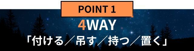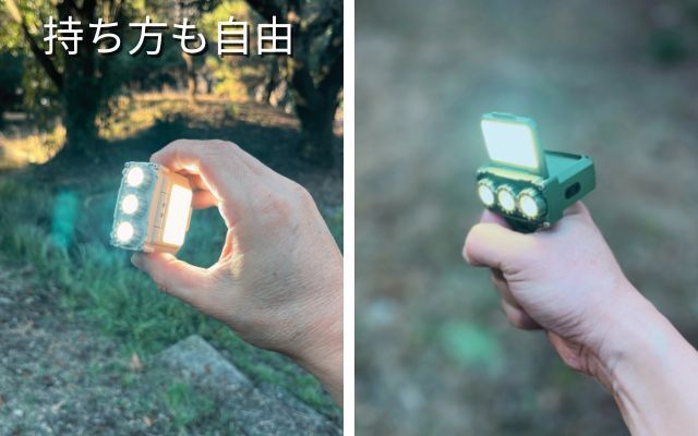 ヘッドライト、ランタン、懐中電灯、置き型ライト(非常灯)の4WAYで使用できる。