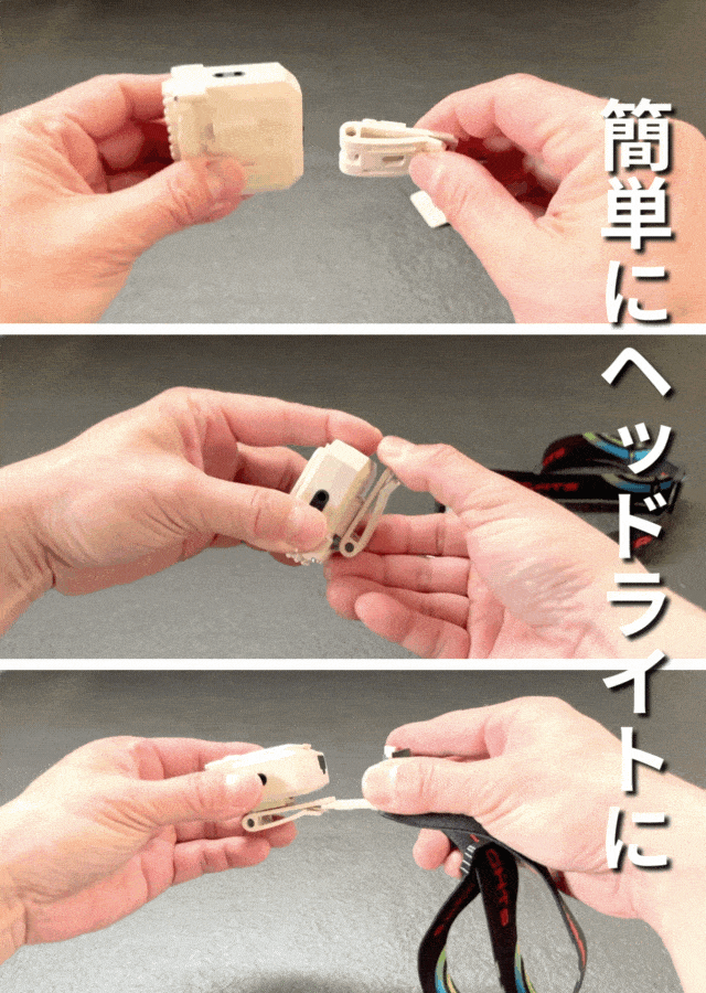■付ける「ヘッドライト、キャップ、パンツ、バックパック等に」