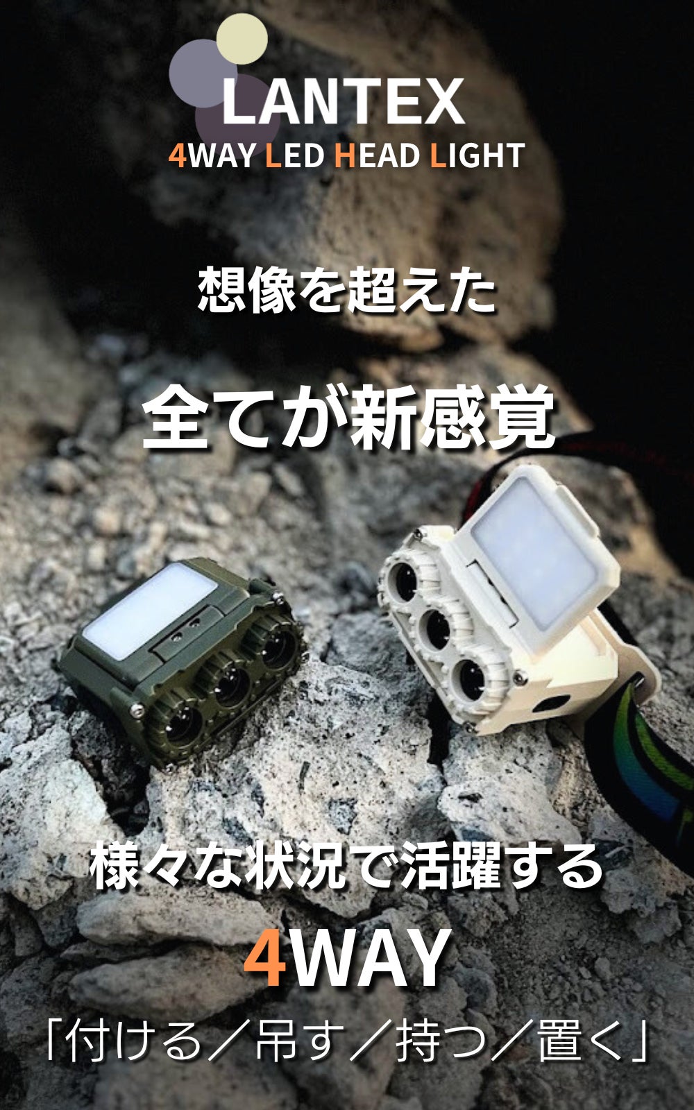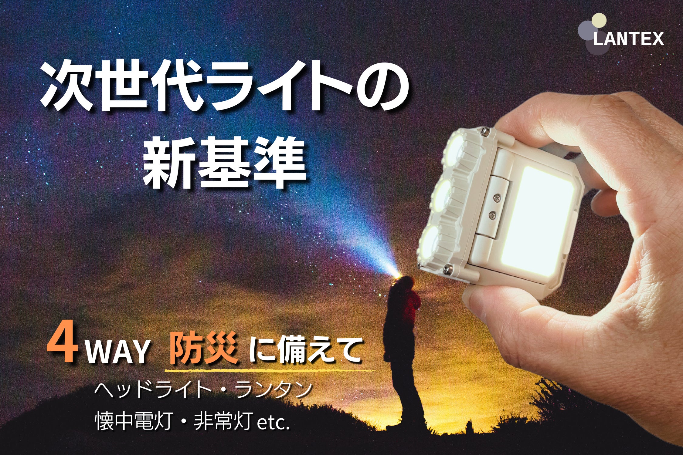 LANTEXは「付ける(ヘッドライト)・吊す(ランタン)・持つ(懐中電灯)・置く(非常灯・卓上ライト)」の4WAY!