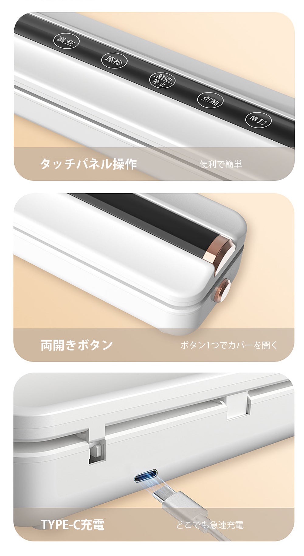 本製品は袋をセットした後、ボタンを1つの簡単操作で自動的に「真空パック」することができます。