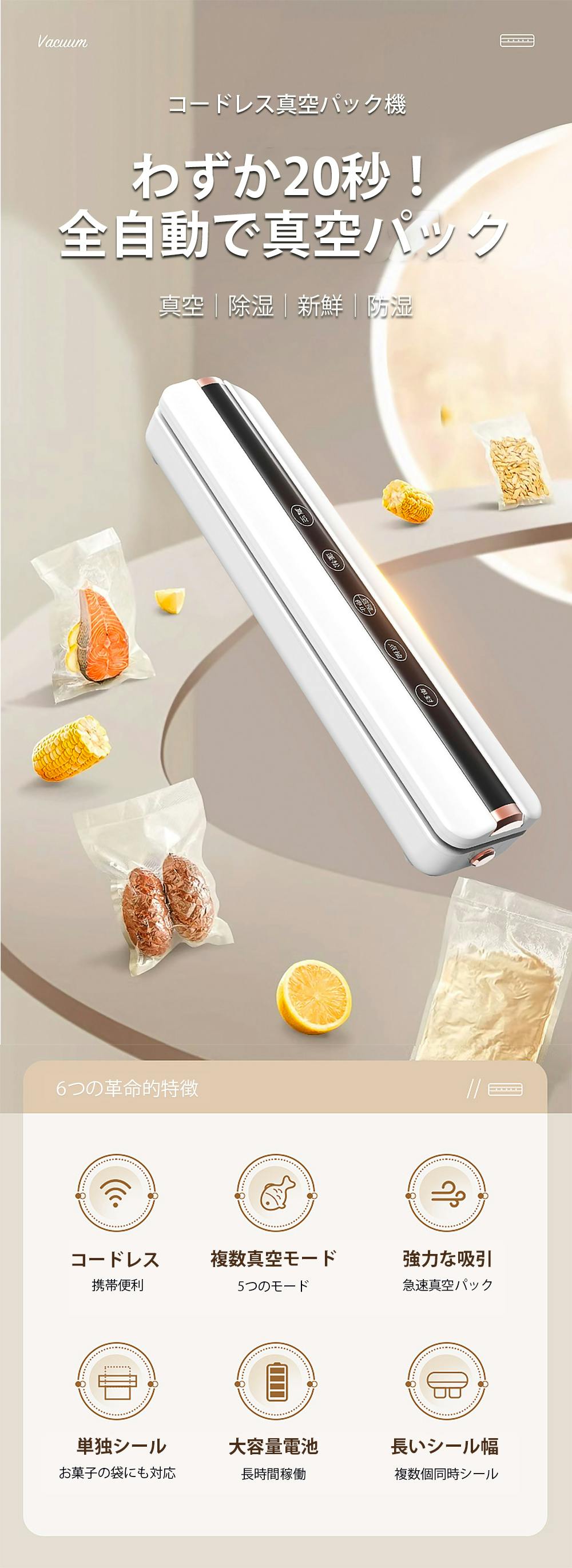 1500mAh大容量バッテリーが内蔵されており、フル充電で約50回、コードレスで真空パック機能を利用できます。