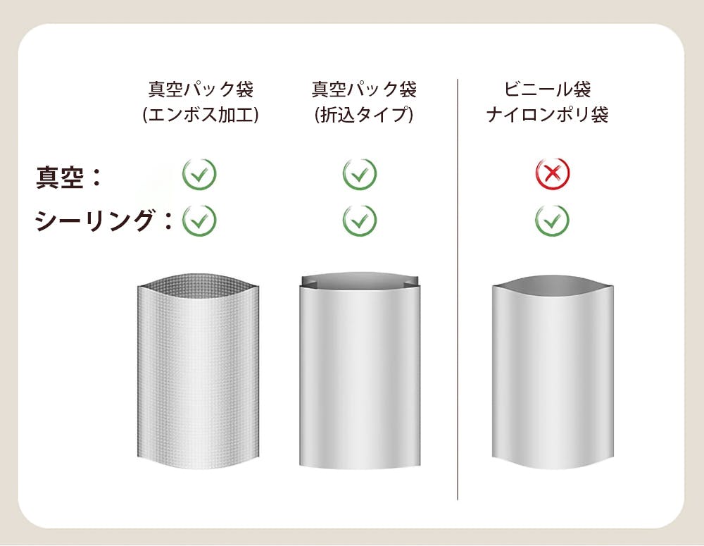 「手動空気抽出モード」はボタンを1回押すごとに一定量の空気を抽出します。パックの状況を確認しながら作業できるので、卵やクッキーなど割れやすい食材はこのモードを使用します。