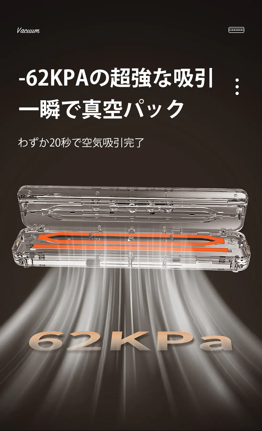 350mlのアルミ缶が潰れてしまうほどの強力な吸引力で、僅か20秒で真空状態にすることができます。