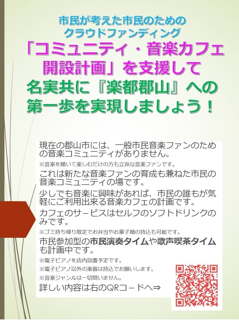 ●郡山市の将来世代に「夢と希望を継続的に与えて続けてくれる社会の実現」への第一歩としての「市民のための音楽の街作り」へと繋ぐ、市民のための「常設の広域コミュニティ・音楽カフェ」開設に向けての社会貢献事業プロジェクトです。
