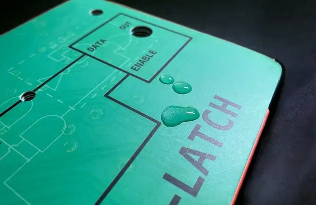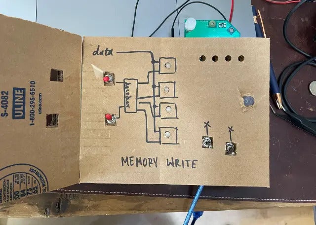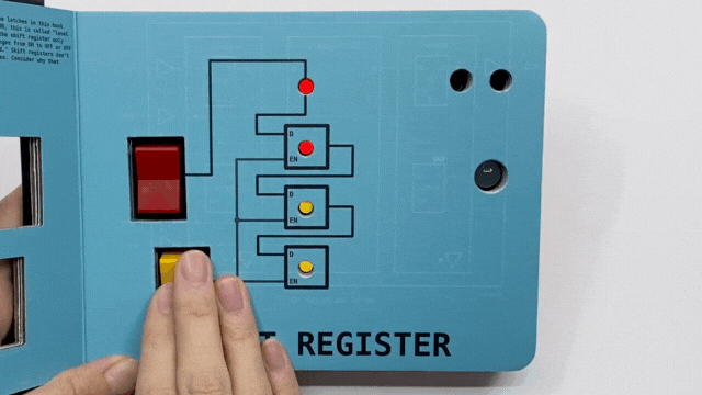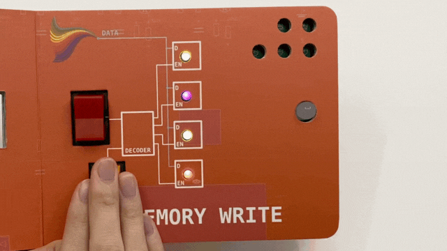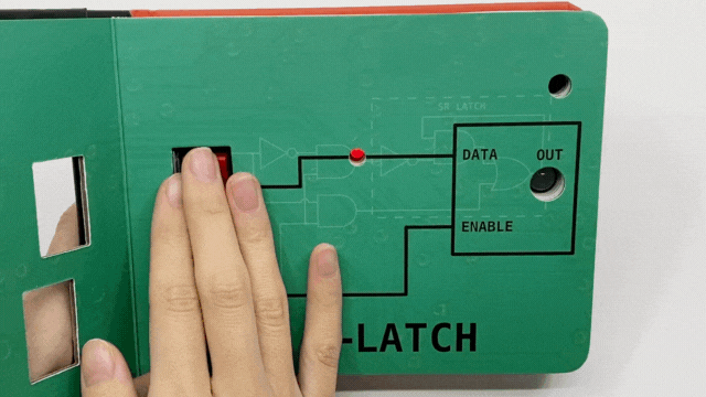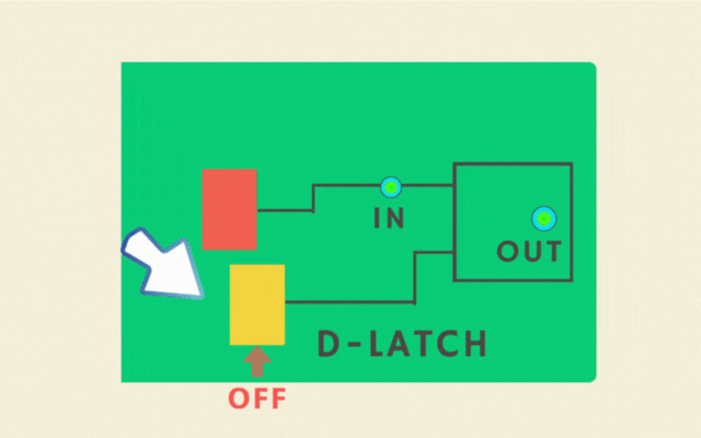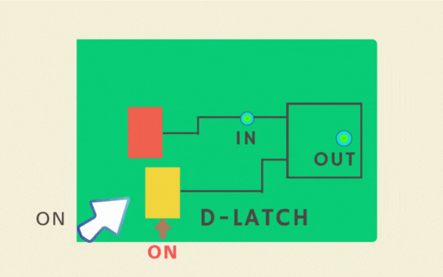 データを一時的に記憶できるもっともシンプルな論理回路です。赤色のスイッチで色が変わる。