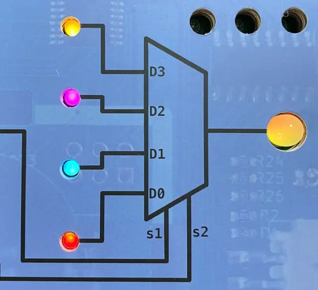 スイッチの組み合わせで4つのライトの中から一つの色をOUTに送ります。