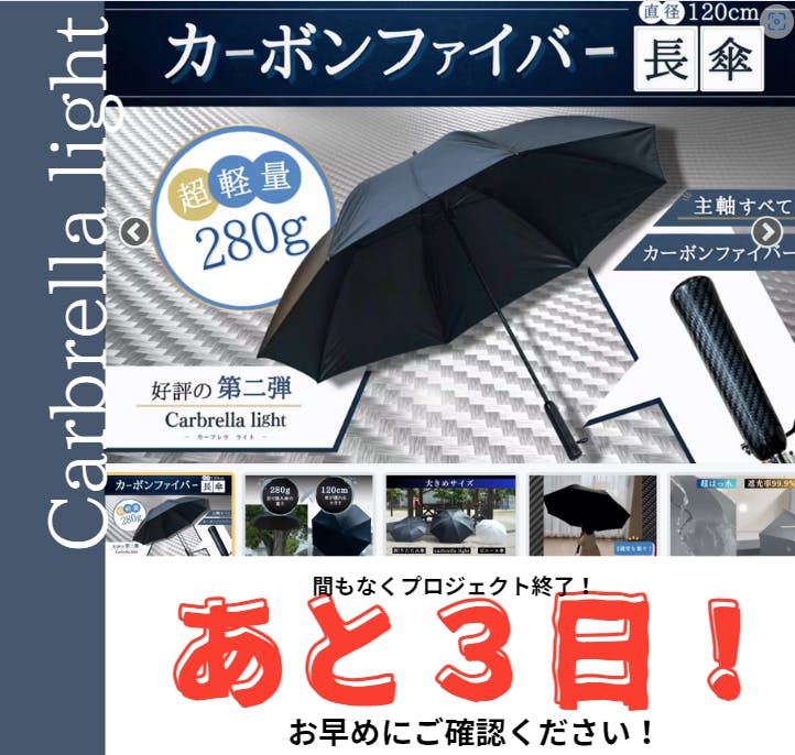大きくて軽いカーボンファイバーのCarbrella light!プロジェクトがまもなく終了間近!