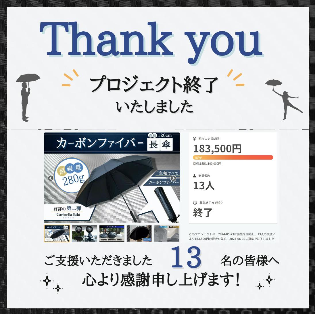 2024/07/01 12:00\プロジェクトが終了しました/みなさまに感謝御礼申し上げます5/8より始まりました本プロジェクトは、挑戦期間を無事終えることができました。第二弾Carbrella light!13名の皆様にご支援いただき総額183,500円となりました! ご支援だけでなくあたたかいメッセージをたくさんいただき、感謝の気持ちでいっぱいです。心より感謝申し上げます。今後も「愛媛の職人」を応援する商品を発信してまいりますので、引き続き応援のほどよろしくお願い申し上げます!(^^ もっと見る