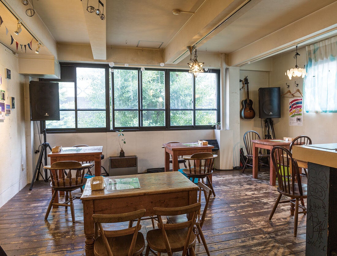 スピーカーも今よりデカい、床板も改装前だったのでボロボロ、見切れてるけど改装前はカウンターが長くてホールが狭かった