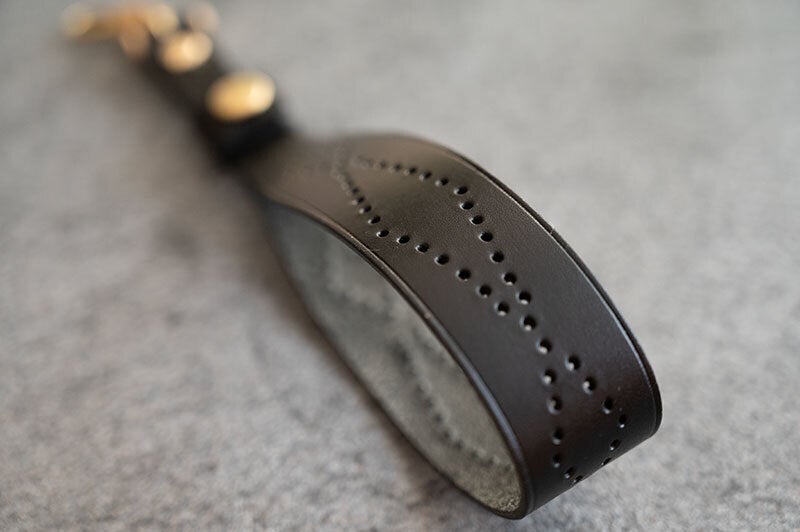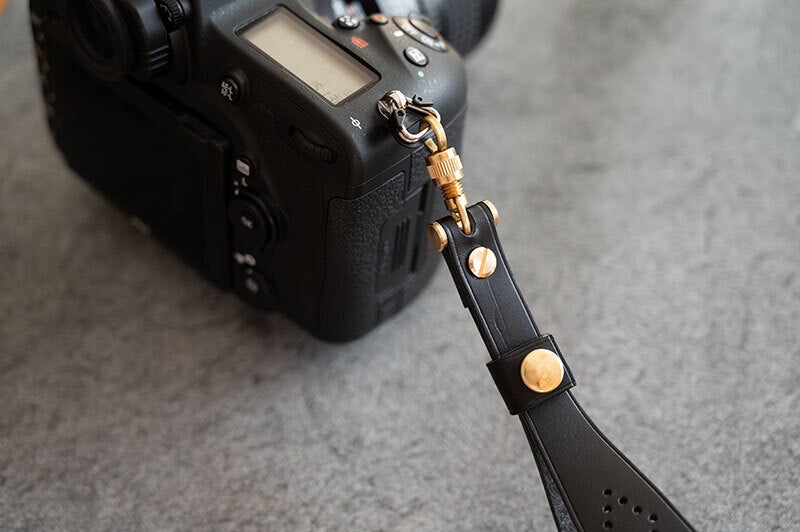 一般的なストラップはベルト式などを採用していますが、こちらのアイテムは特徴的な真鍮製のネジ式金具を採用しています。