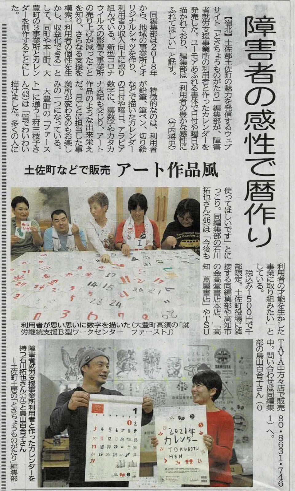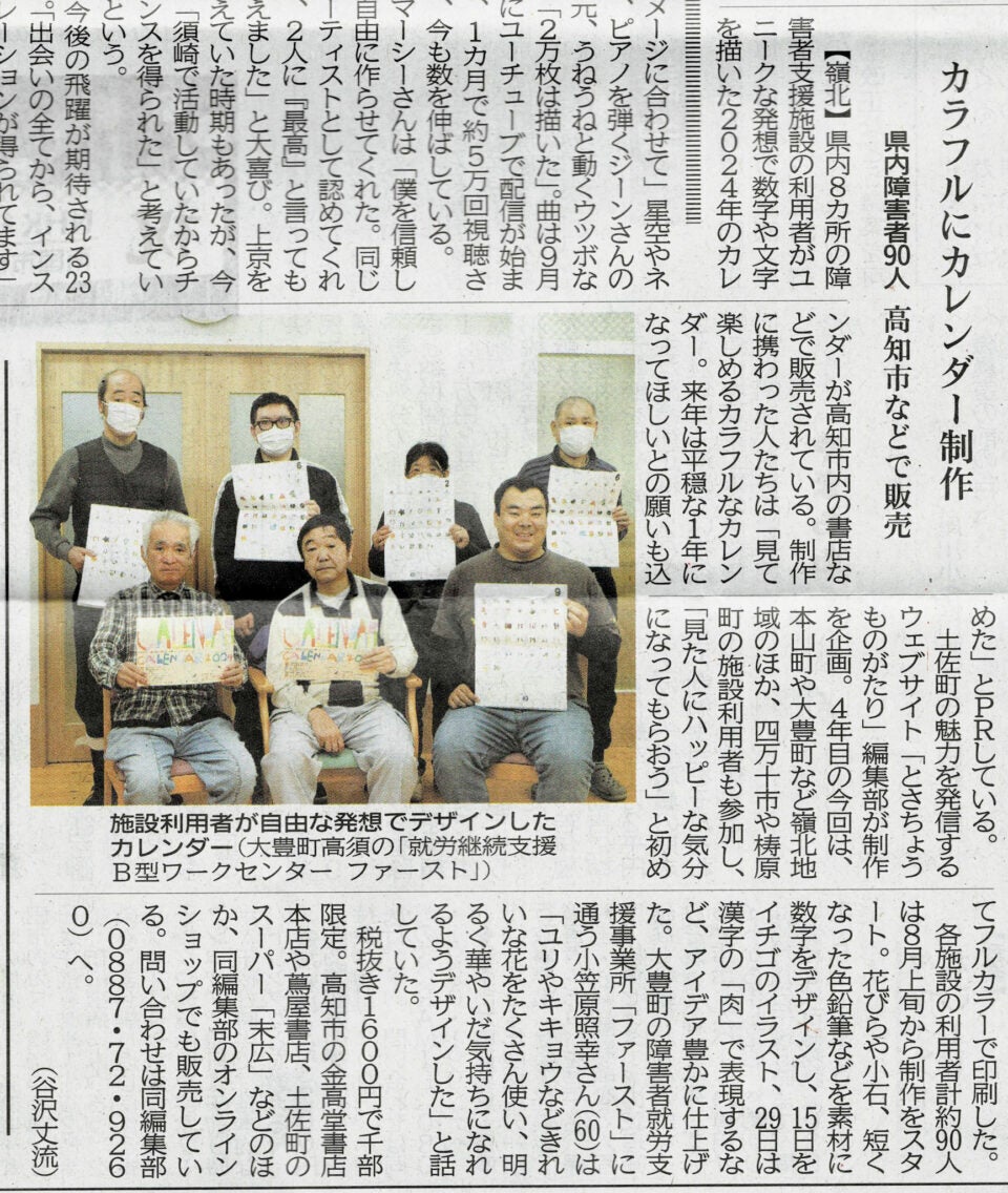”障害者の皆さんの楽しい表現活動がお金を生み、やりがいになり、社会とつながっていく。このカレンダーづくりは、「とさちょうものがたり」が続けている素敵なものづくりの仕組みです。高知新聞も意義を感じ、これまで何度も取材して紹介してきました。CFを通じて、より多くの方に触れてほしいと思います。”