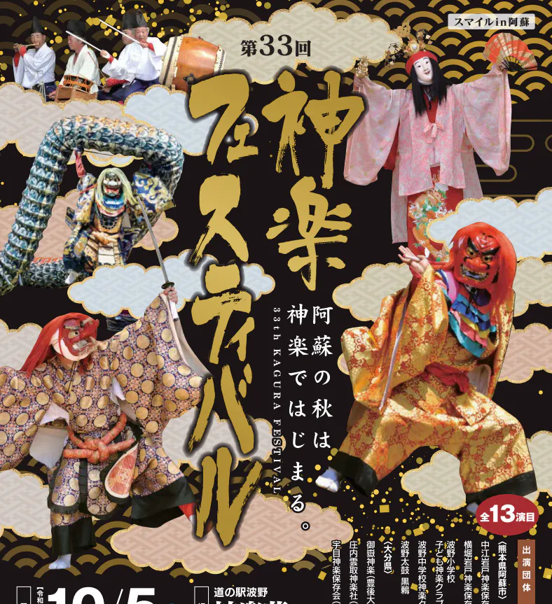 2024/09/20 19:03第33回スマイルin阿蘇 神楽フェスティバルを開催します神楽フェスティバルを今年も開催します。地元阿蘇市波野の中江岩戸神楽保存会、横堀岩戸神楽保存会、大分県の団体など8つの団体が出演予定です。勇壮な神楽の舞をお楽しみください。日時10月5日(土曜)午前9時~午後5時(開場8時30分) 会場道の駅波野「神楽苑」※道の駅の駐車場が満車になった場合は波野グラウンドに駐車をお願いします。会場までシャトルバス(無料)を随時運行いたします。 もっと見る