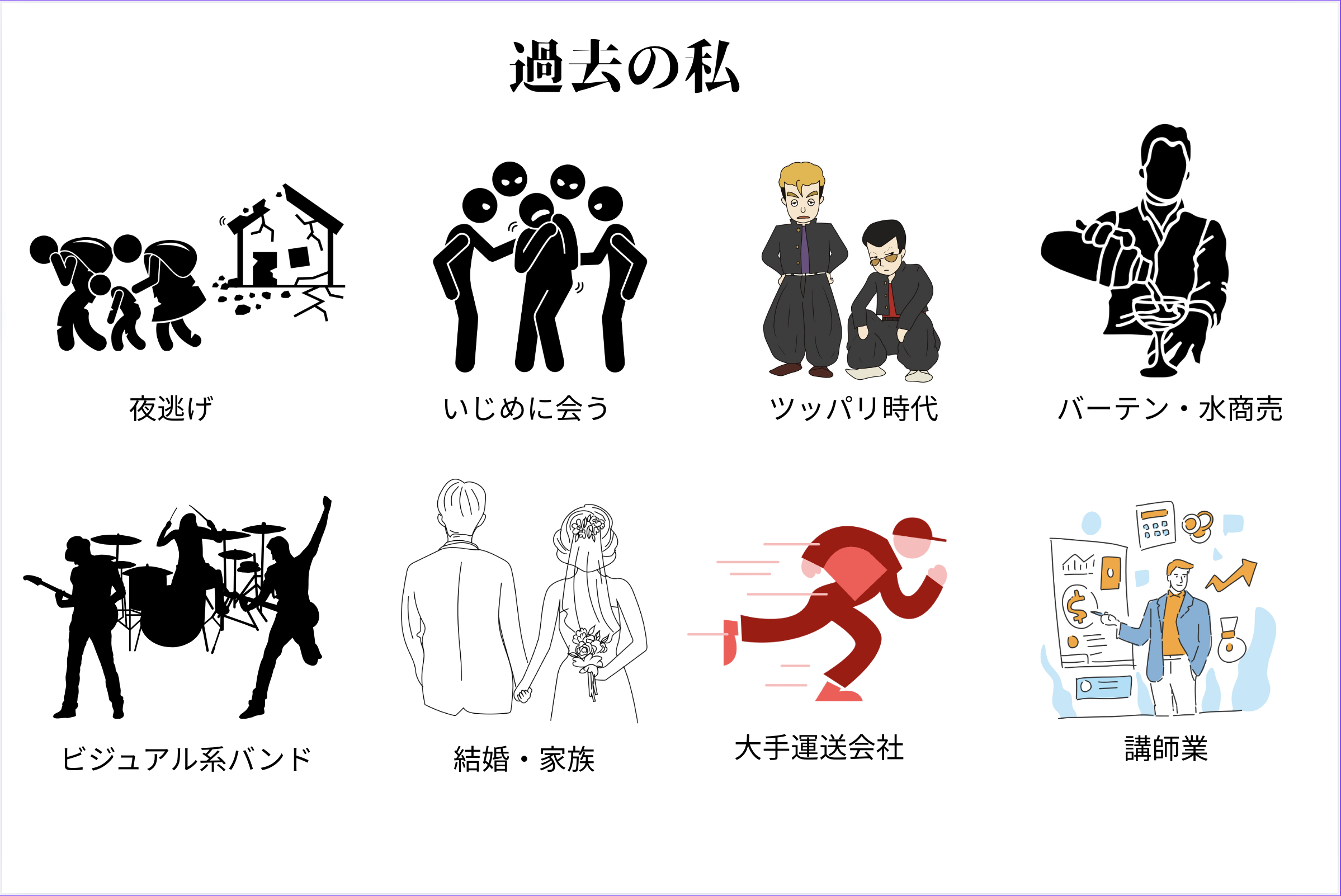 転校でいじめられ、ツッパリ、売れないバンドマン、水商売で生計を立てていました。
