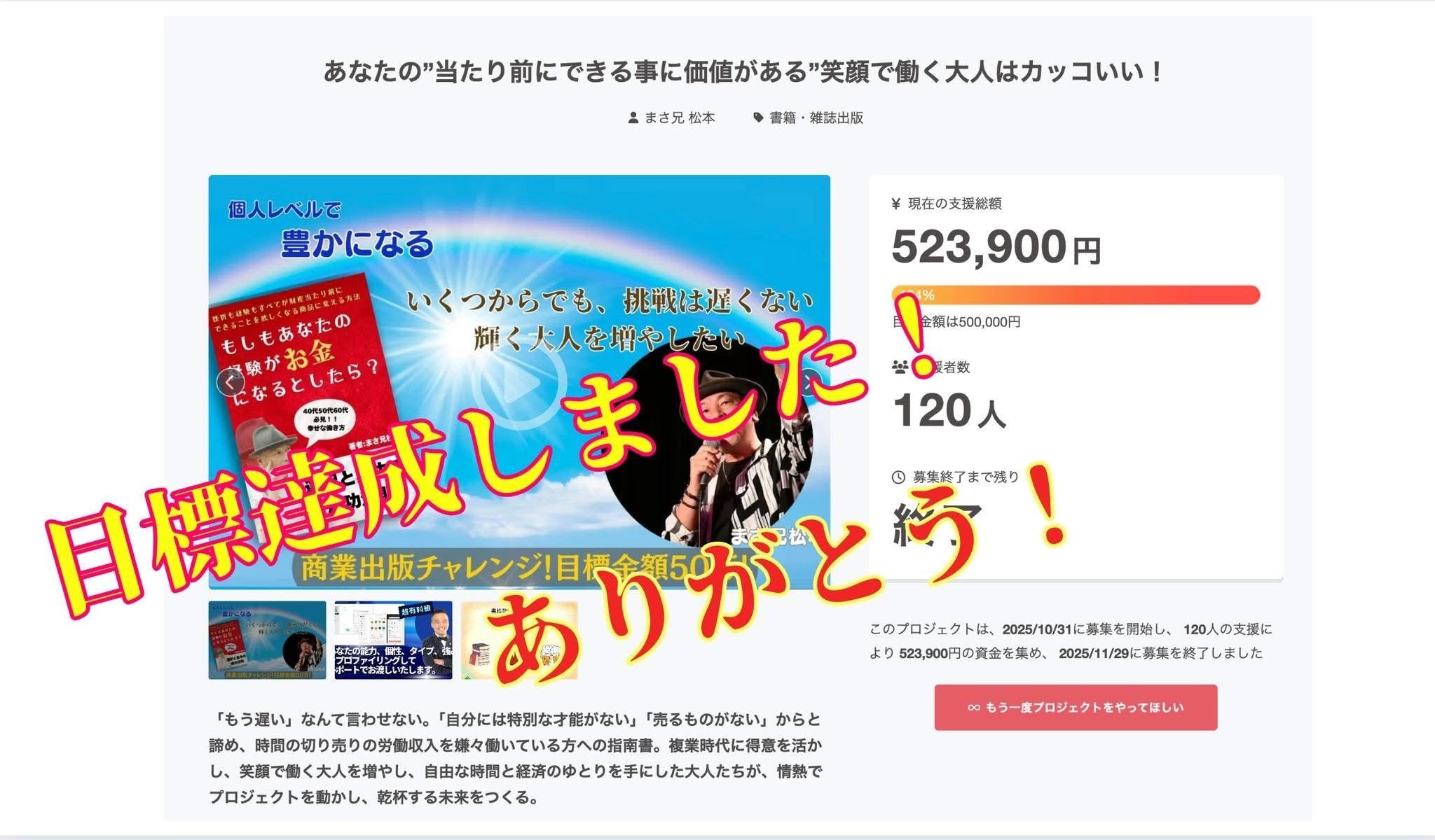 2025/12/04 09:09「あなたの”当たり前にできる事に価値がある”笑顔で働く大人はカッコいい!」プロジェクトオーナーのまさ兄 松本です。プロジェクトの目標金額を達成したので、ご報告させていただきます。皆様のご支援、ご協力によりプロジェクトが成功しましたこと、感謝申し上げます。現在の支援総額:523900支援者数:120※詳細はこちらからご覧いただけます。https://camp-fire.jp/projects/759768/viewプロジェクト終了後、支援者の皆様へ順次リターンのご対応をさせていただきます。改めて、ご支援いただきまして誠にありがとうございます。それでは、引き続きよろしくお願いいたします。 もっと見る