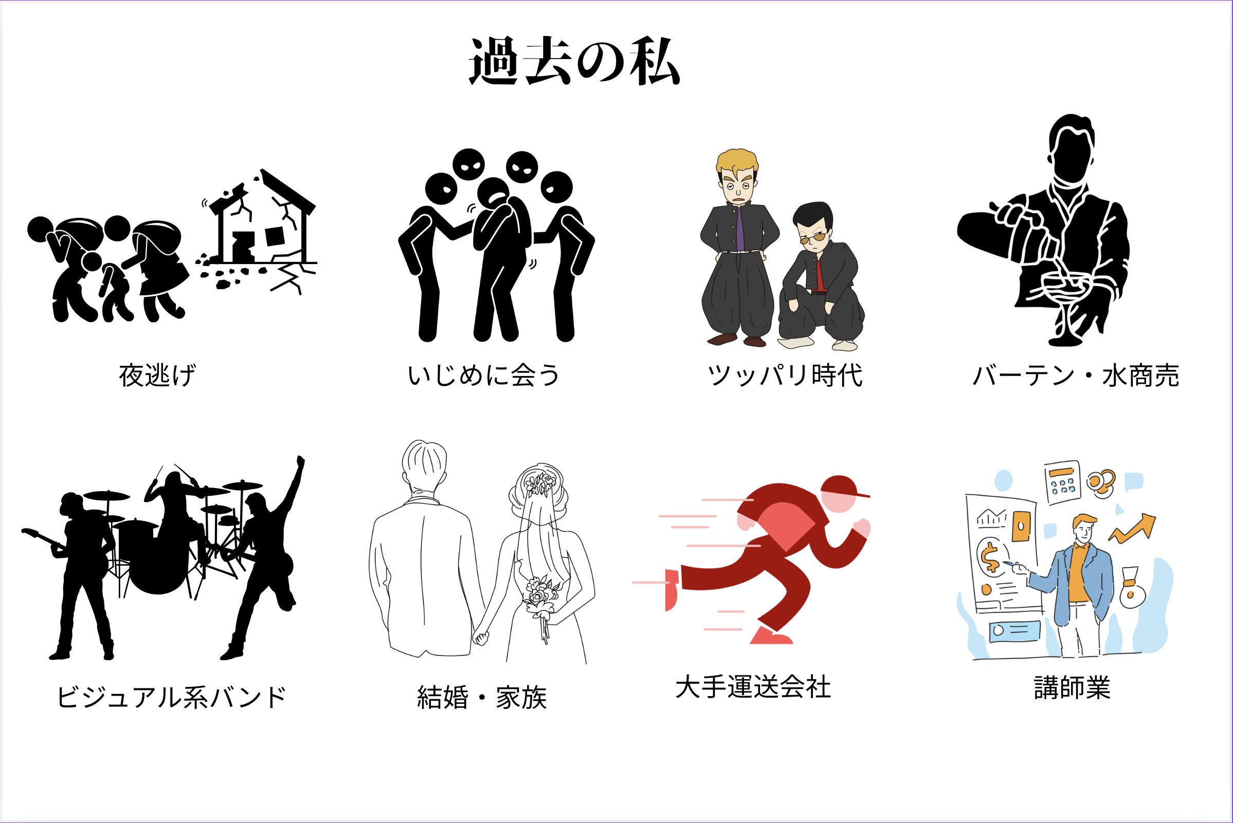 転校でいじめられ、ツッパリ、売れないバンドマン、水商売で生計を立てていました。