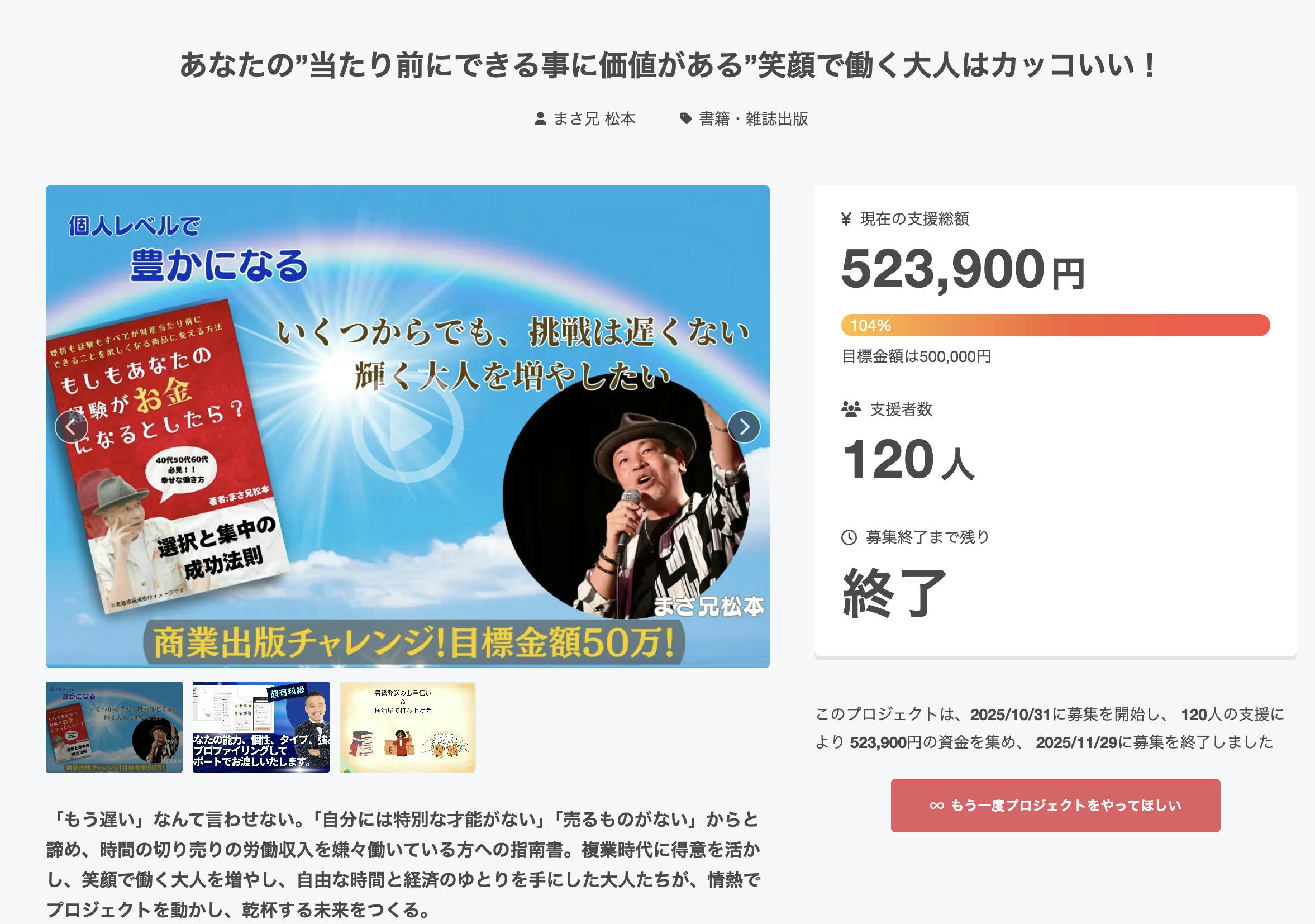 2025/12/04 09:09「あなたの”当たり前にできる事に価値がある”笑顔で働く大人はカッコいい!」プロジェクトオーナーのまさ兄 松本です。プロジェクトの目標金額を達成したので、ご報告させていただきます。皆様のご支援、ご協力によりプロジェクトが成功しましたこと、感謝申し上げます。現在の支援総額:523900支援者数:120※詳細はこちらからご覧いただけます。https://camp-fire.jp/projects/759768/viewプロジェクト終了後、支援者の皆様へ順次リターンのご対応をさせていただきます。改めて、ご支援いただきまして誠にありがとうございます。それでは、引き続きよろしくお願いいたします。 もっと見る