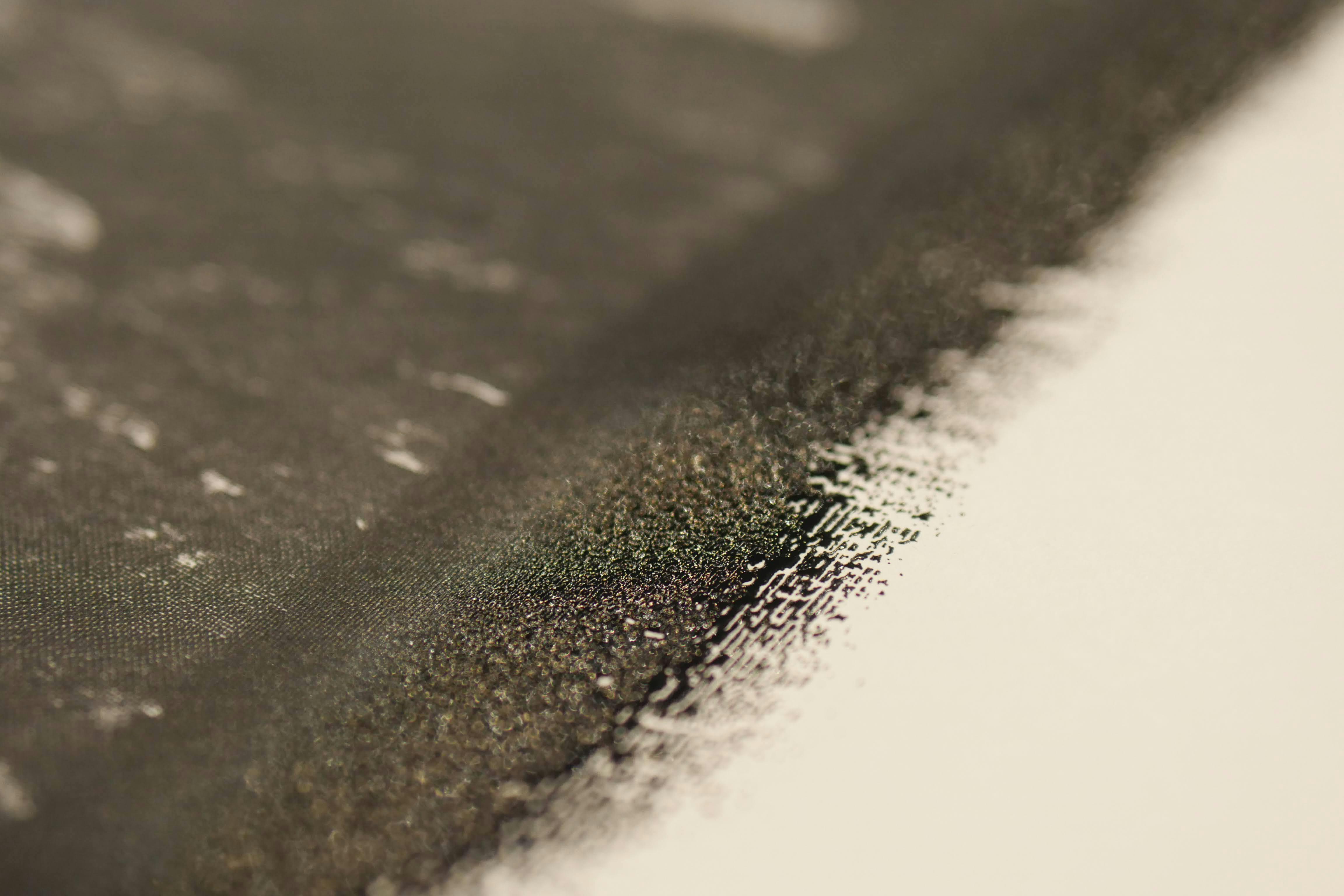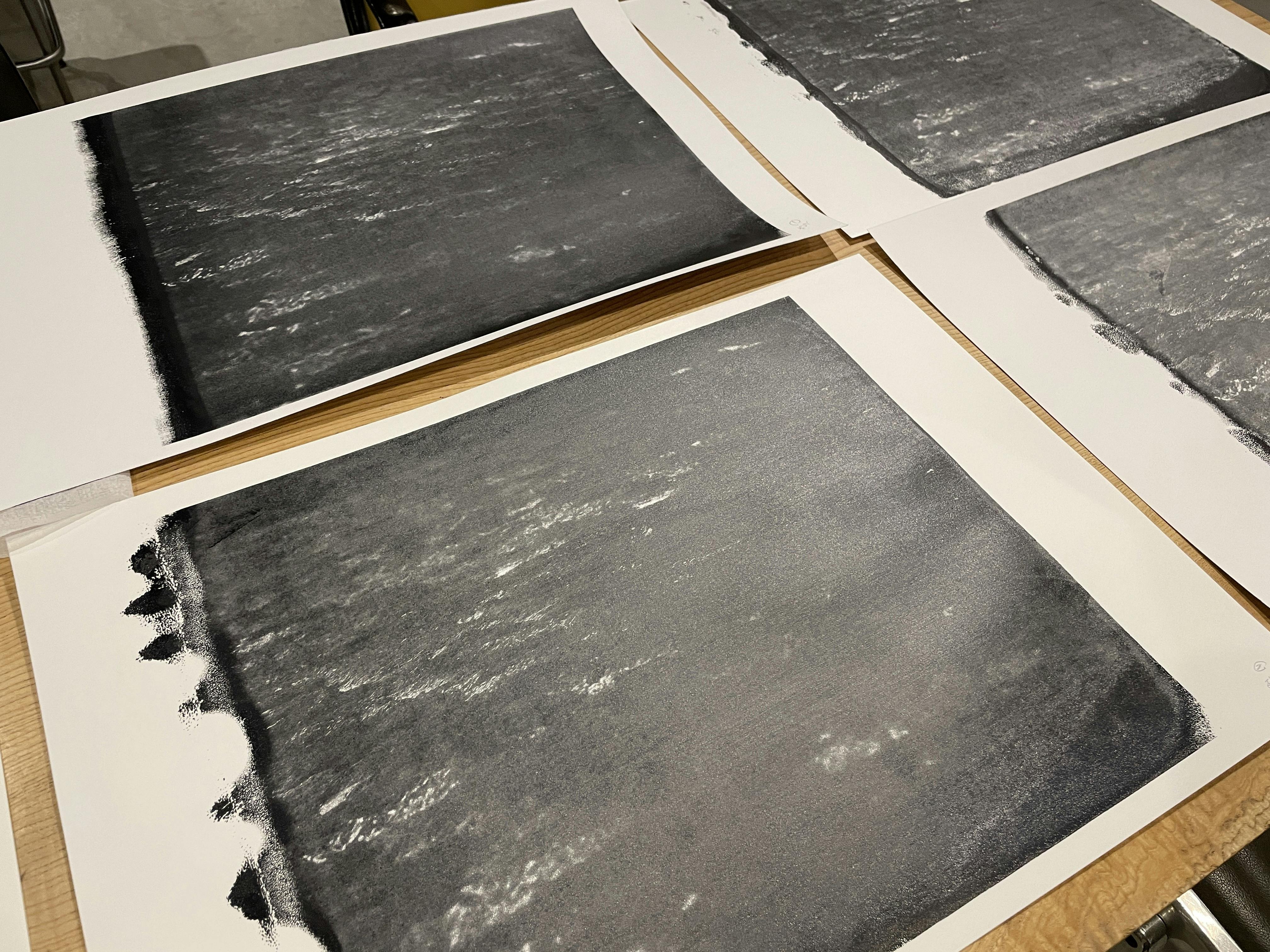 手持ちの岩肌の写真を使っていくつかプリントの検証を行いました。単色プリントの手法として、リソグラフ・シルクスクリーン・サイアノタイプの3種を実験してみました。実験前はサイアノタイプが有力候補でしたが、実際にやってみると、意外なことに黒インクによるシルクスクリーン版画の表情が美しく、プリント作品をシルクスクリーンで作ることにしました。