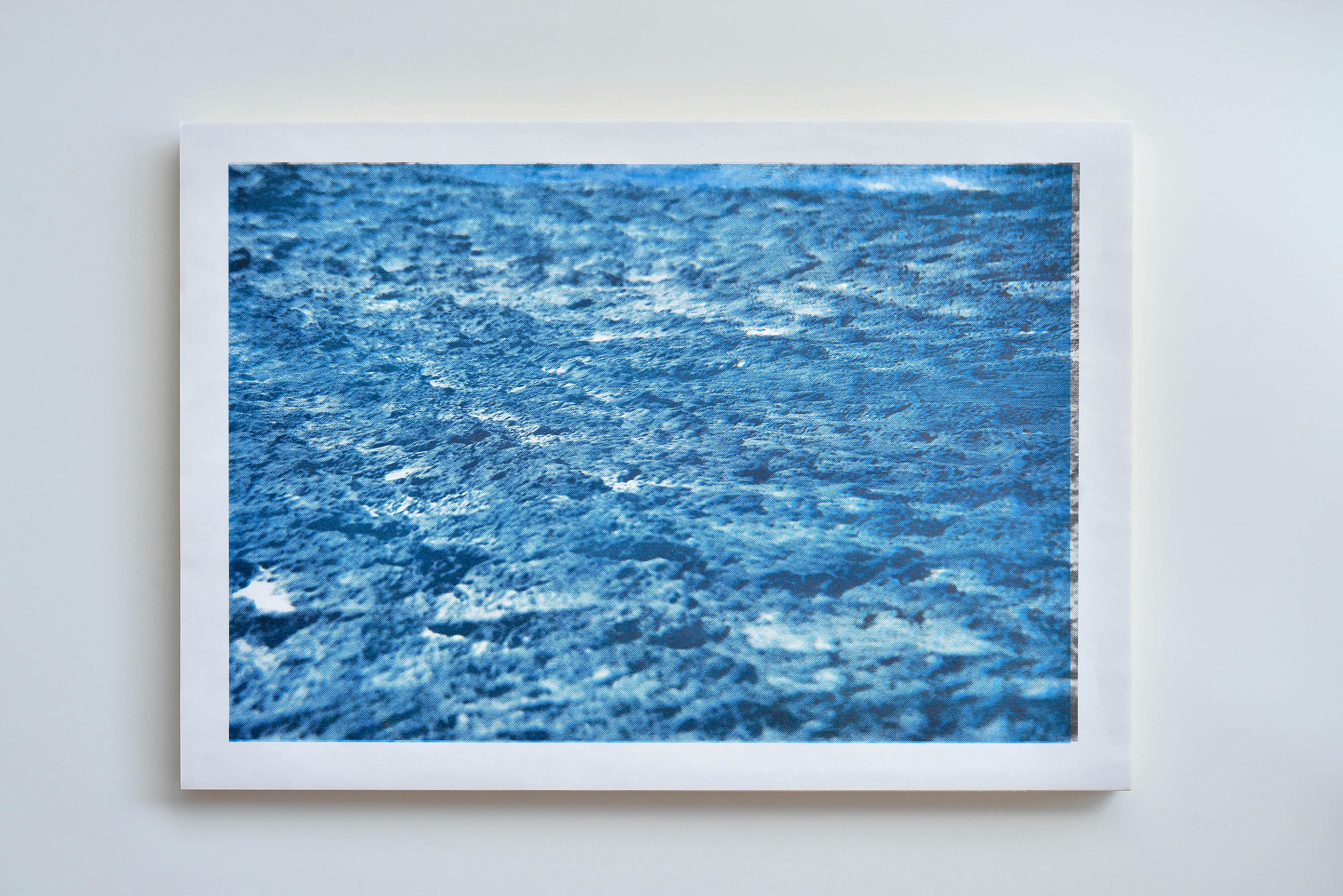シルクスクリーンやリソグラフのように、穴を開けたフィルムの版から、インクを通すことで刷る孔版印刷の版画作品であることがこれまでと大きく異なります。岩肌の写真から孔版印刷の版を製版し、青と黒の2色刷りを行うと、そこに海の景色が浮かび上がるプロジェクトです。