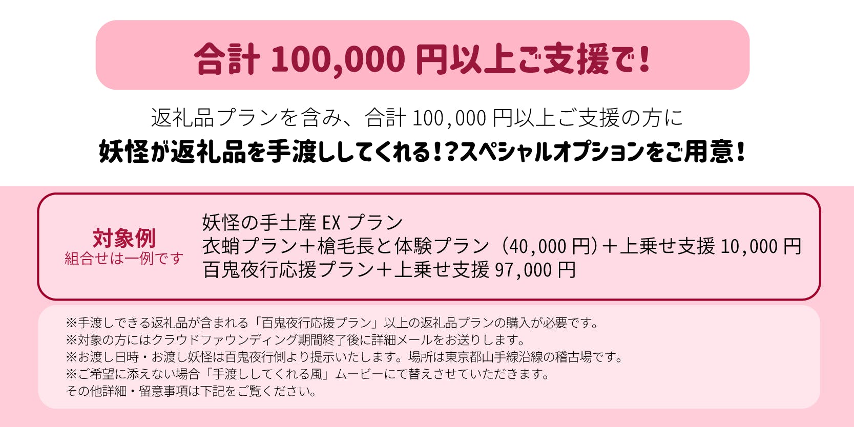 今回のリターンにつきましては合計100,000円以上ご支援頂いた方にスペシャルオプションをご用意しております!