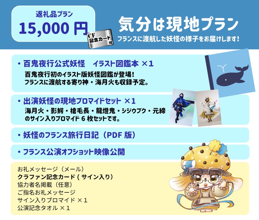 • 日頃、百鬼夜行を応援していただき誠にありがとうございます。本日、『気分は現地プラン』『衣蛸プラン』にご支援いただいた皆様へ、下記のリターンのメールをお送りいたしました。大変長らくお待たせしてしまい申し訳ございません。ご確認をお願いいたします。『気分は現地プラン』・旅行日記(pdf版)『衣蛸プラン』・旅行日記(pdf版)その他のプランの送付につきましては近日より順次発送してまいります。お待たせして大変申し訳ございませんが、今しばらくお待ちいただきますようお願いいたします。再度のお知らせとなりますが下記のリターン品に関しましては2025年2月の発送となります。『もっと現地!プラン』・CFカード(サイン入り)・イラスト図鑑・旅行日記(書籍版)こちらも遅れが生じておりまして2月上旬の発送予定となりますこと大変申し訳ありません。今しばらくお待ちいただきますようお願いいたします。今後とも百鬼夜行をよろしくお願いいたします。 もっと見る