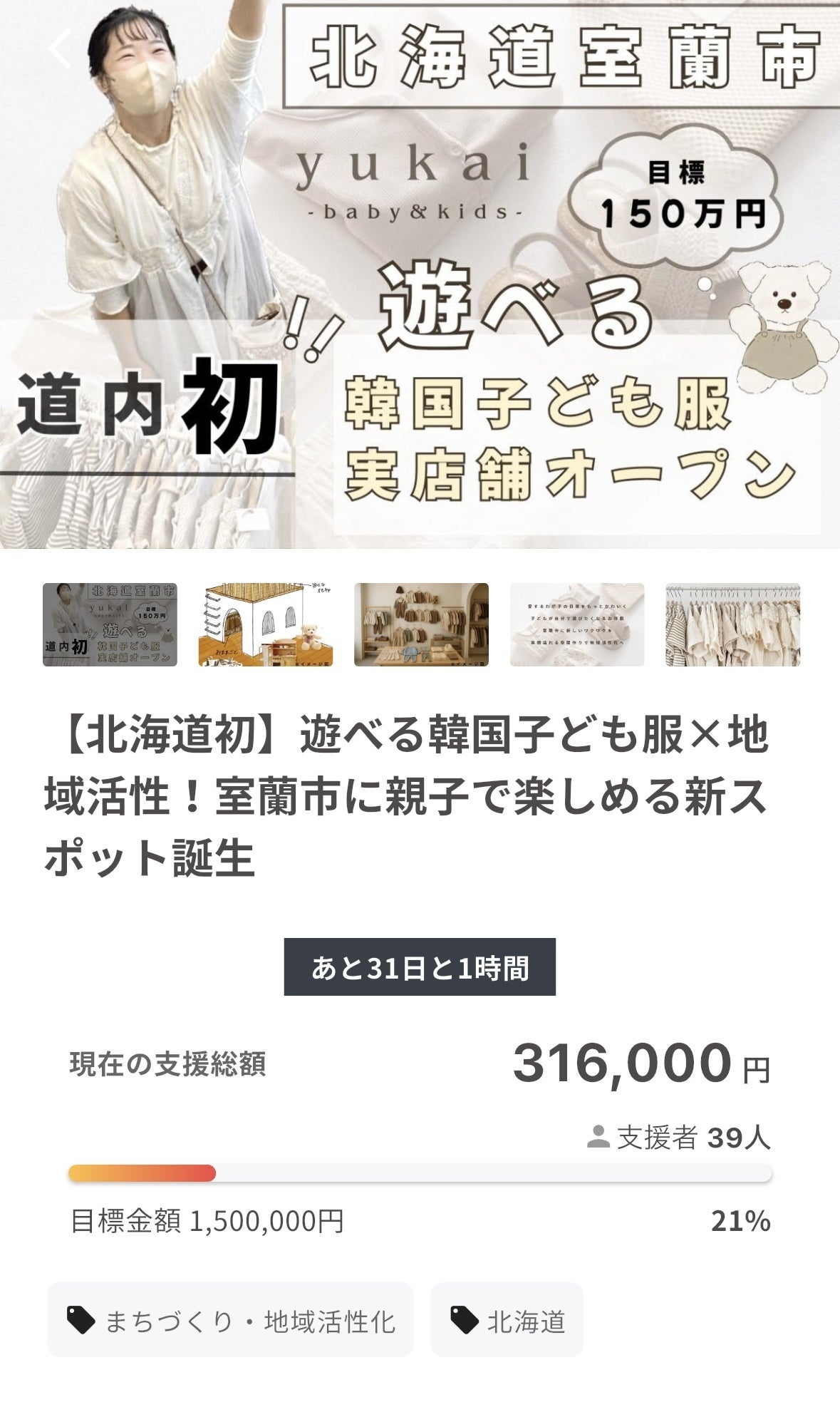 2025/04/23 14:36みなさまのおかげで日々少しずつ%が上がってきております。本当にありがとうございます。今現在の進捗状況は、当初のお部屋を自分たちの力で改修しております。進める中で、この方がいい!が出てきておりますので、状況に合わせて変更しながら進めております。DIYが大半ですので、時間はかかりますが、それでも自分たちで!というところに意味があり、より愛着が湧きます。北海道初!室蘭市に遊べる韓国子ども服実店舗オープンまで、見届けて頂けましたら嬉しいです!引き続き、応援よろしくお願い致します。 もっと見る