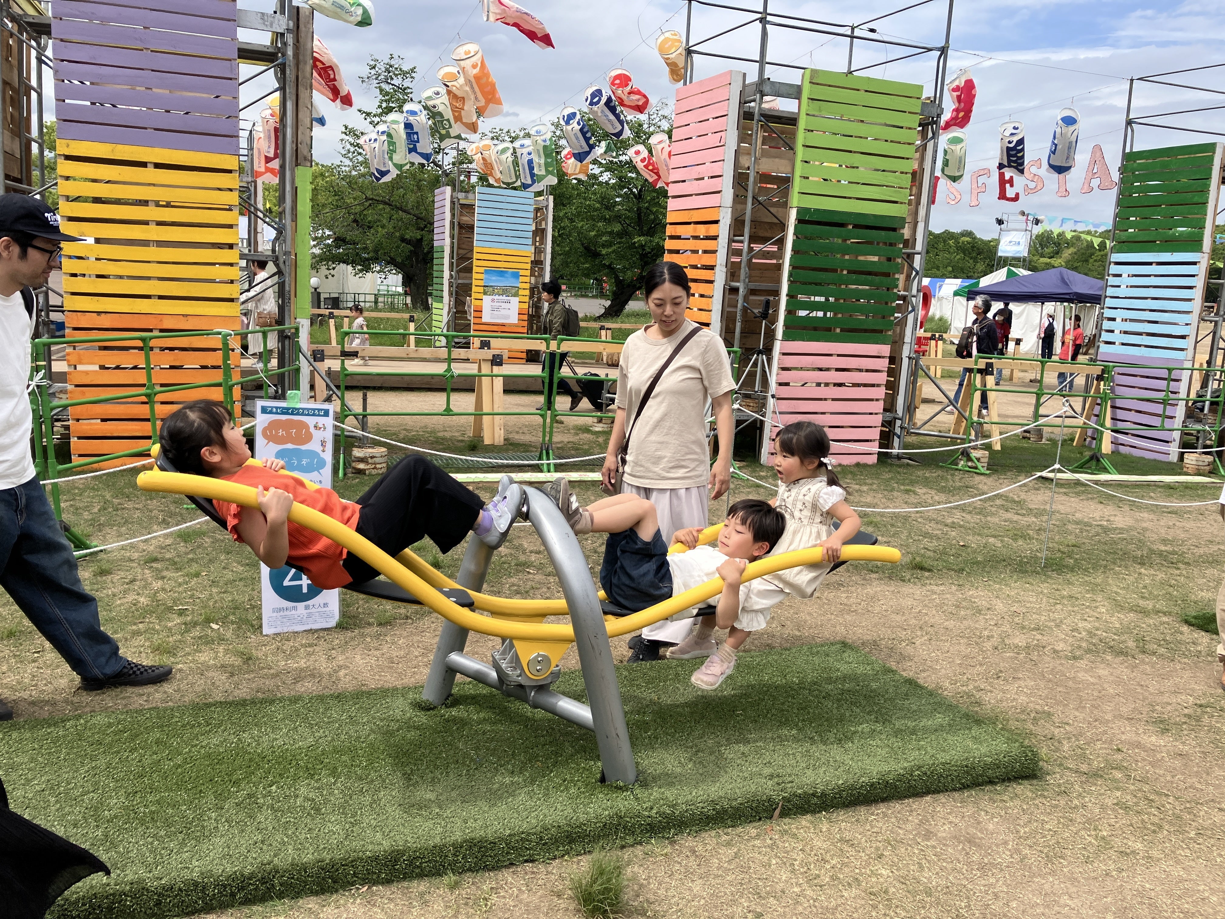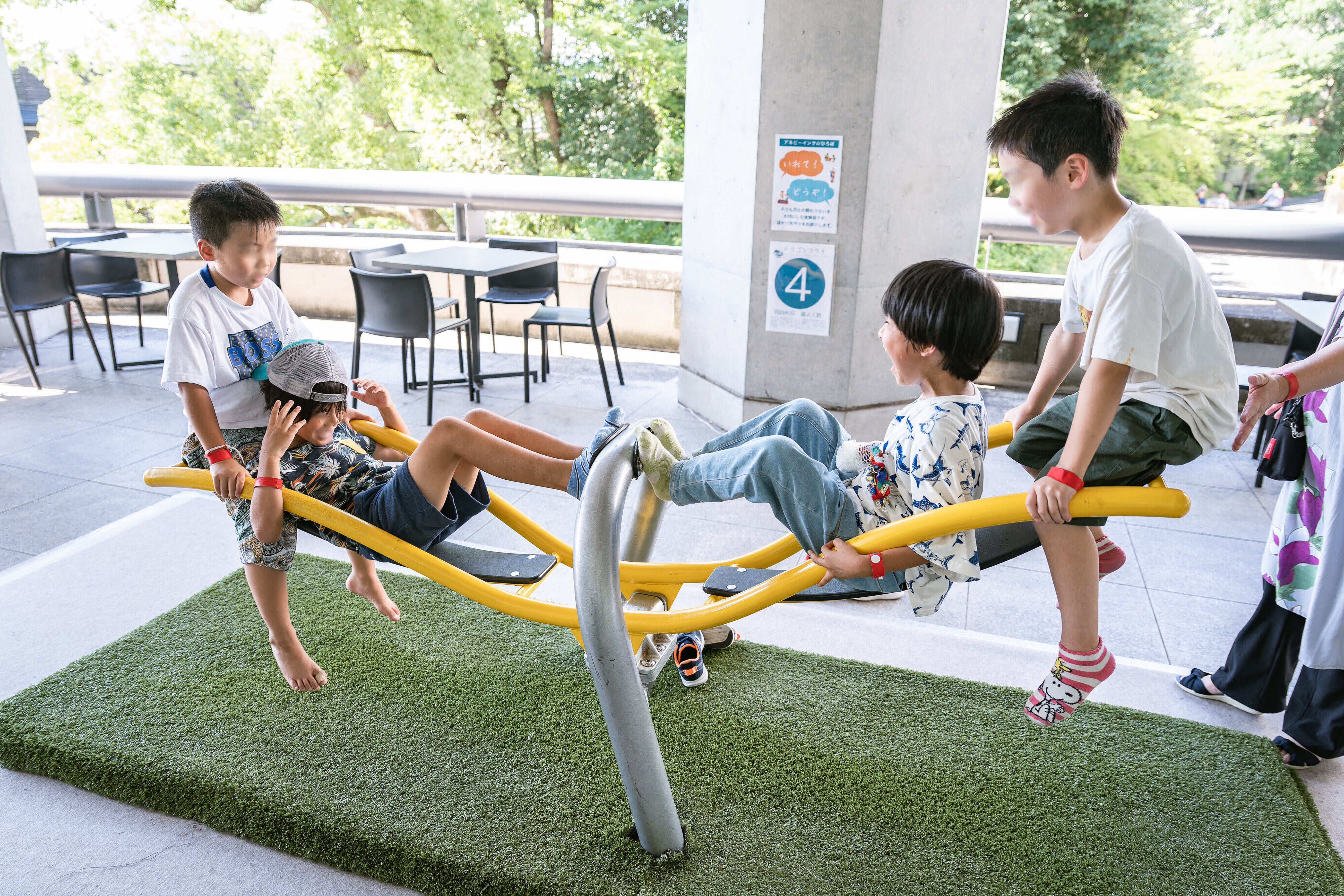 2024/07/31 17:27土曜日に一時降った雨をのぞいてお天気に恵まれた二日間。北白川通りに面した大階段をあがってすぐのピロティ、続く外回廊にアネビーさんのインクルーシブ遊具が並びました。運動が苦手かも…という心配はご無用。それぞれの身体と相談しながら、乗り方、動かし方などを工夫して様々な遊び方を楽しめるのが魅力です。暑い中ではありましたが、たくさんの子ども達が笑顔で遊んでくれました!今回会場には、ご来場の皆さんがそれぞれのペースで時間を過ごせるよう、絵本コーナーやおえかきコーナー、休憩スペースを設けました。絵本コーナーには参加アーティストや劇場スタッフのおすすめの絵本が自分が好きだったなつかしい絵本もあり、いろんな世代で作品世界を共有できるのは素敵なことだなとほっこりしました。おえかきコーナーには描き終えた絵を飾れるスペースも設置。おえかきに夢中の姿をパチリ瓜生山サマーパークでは、特別なフードメニューもご用意。学内のカフェ「BREATH KUA」、ベーカリー&カフェ「進々堂」さん、近隣のキンパと本格韓国惣菜のテイクアウト専門店「コンジュキンパさん」にご協力いただいた特別メニューやキャンペーンをお楽しみいただきました!撮影:井上嘉和※絵本コーナー、フードメニューを除く もっと見る「ちいさな生きもののブローチをつくる」「地図のワークショップ」開催!!