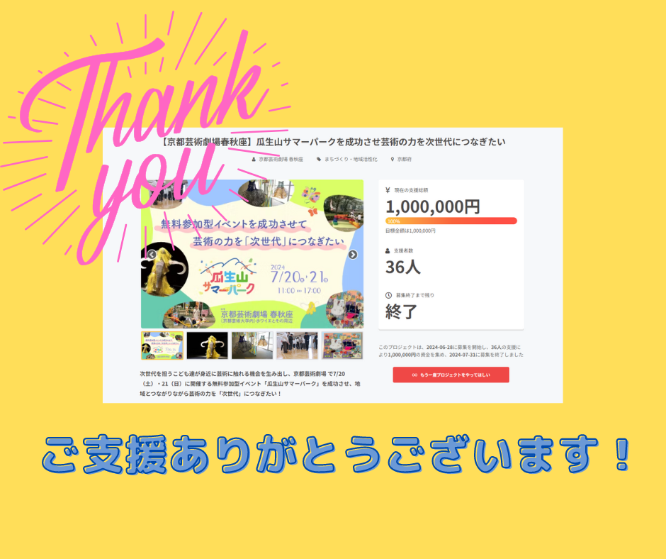 2024/08/01 12:042024年6月28日(金)より開始のクラウドファンディングプロジェクト「【京都芸術劇場春秋座】瓜生山サマーパークを成功させ芸術の力を次世代につなぎたい」は7月31日(水)をもって終了いたしました。無事に目標を達成いたしましたことをご報告いたします。感謝の気持ちを込めて、ご支援者の皆様に順次リターンを履行してまいります。期間中はあたたかくお力添えくださり、誠にありがとうございました。今回の挑戦を出発地点とし、地域にひらかれたイベントの開催を通じて、次世代へ芸術のバトンを渡す取り組みを引き続き展開してまいります。引き続きよろしくお願い申し上げます。 もっと見る