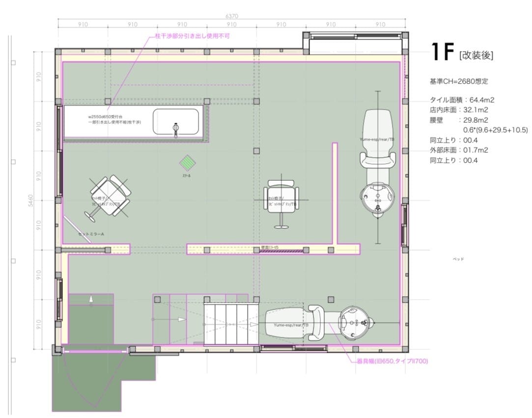 基本の柱、天井は木造そのままの構造を残しつつタイルを均一な高さで貼り古き良き木の雰囲気と現代的なタイルを融合する予定です。