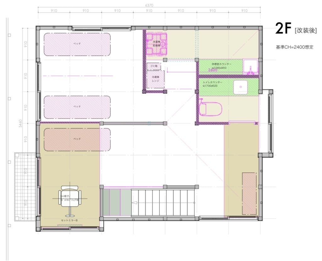 全体的な色はこれから検討、既存木造軸組みを残しつつ凹凸の強い塗装を予定。