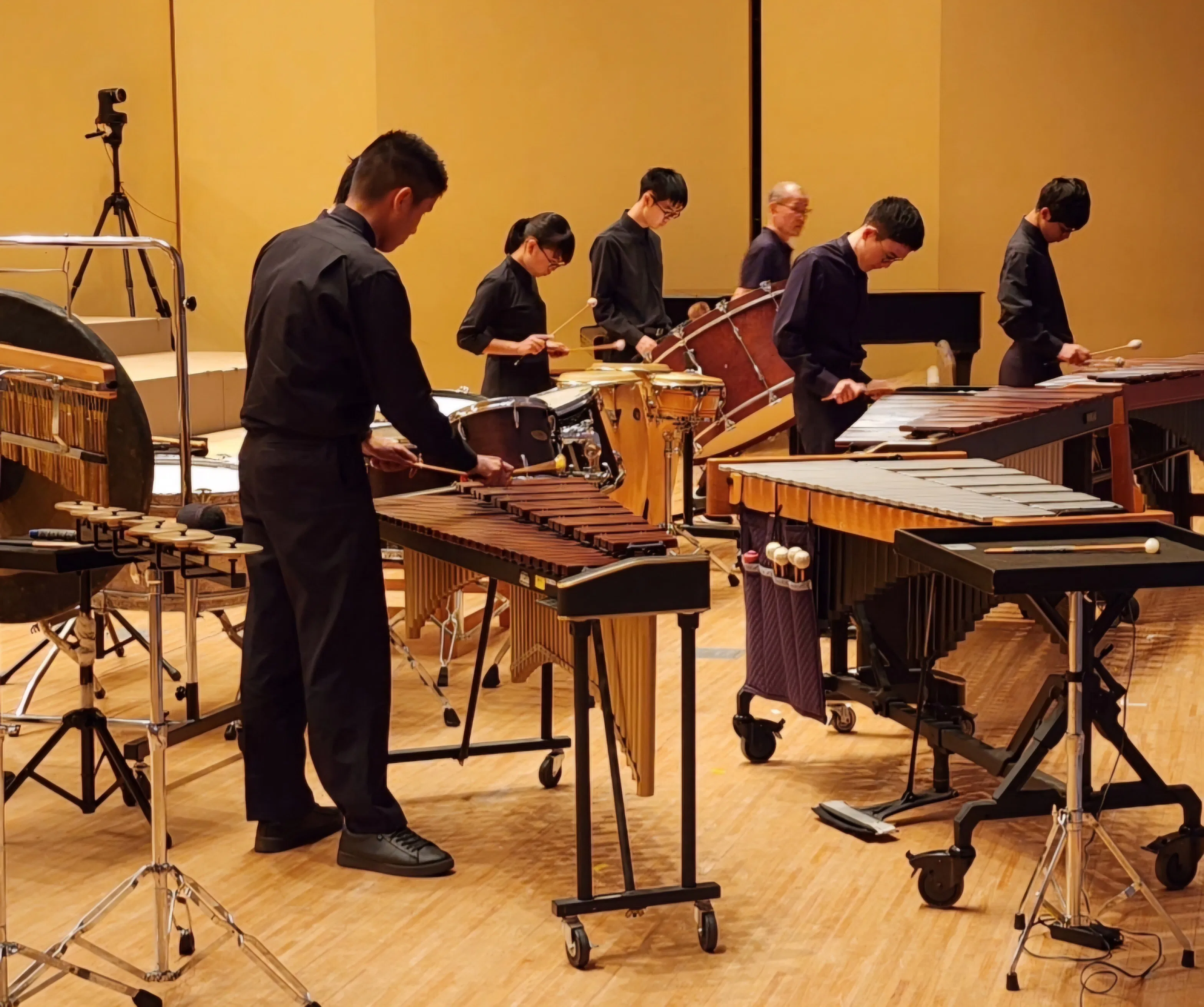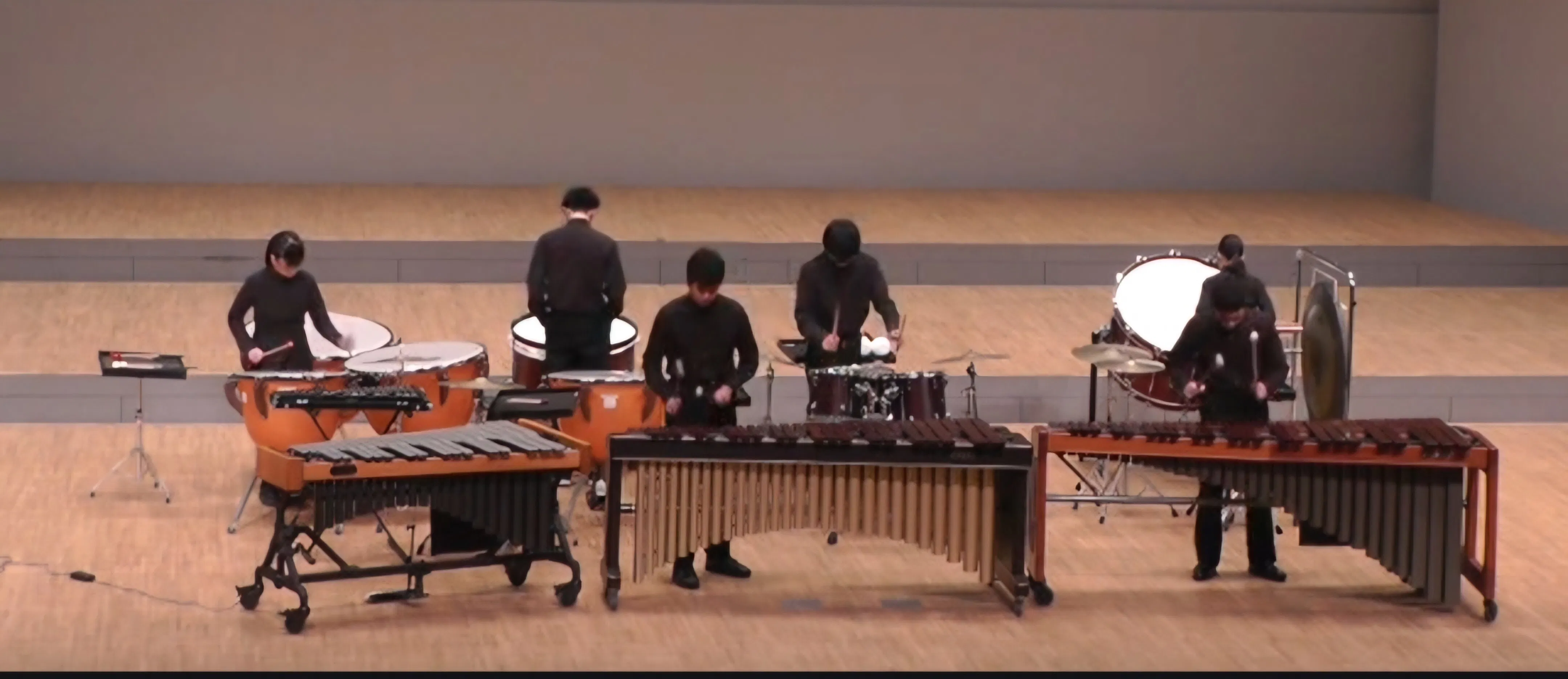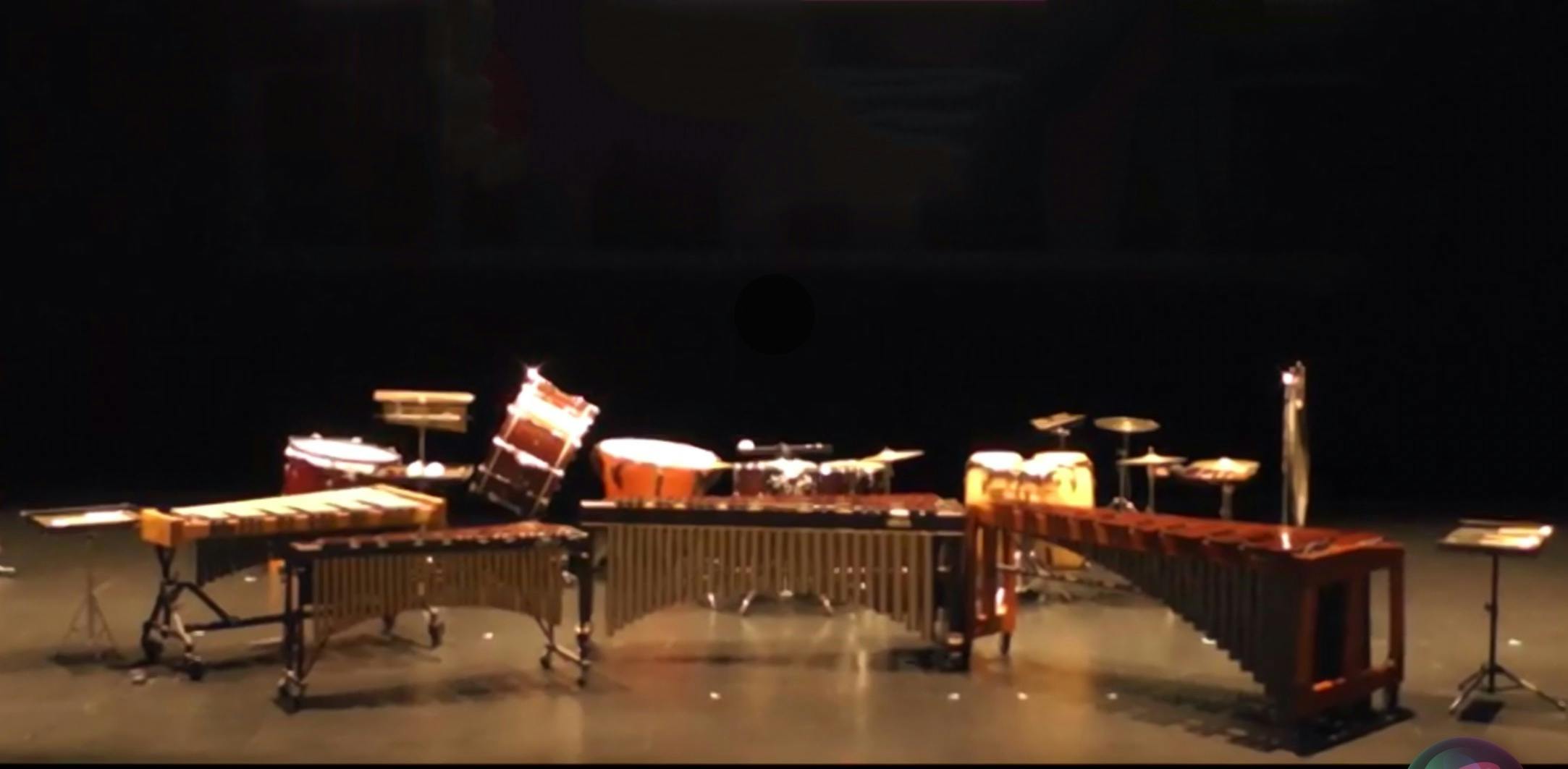 コンサートマリンバ2台、シロフォン、ビブラフォン、コンサートバスドラム、ティンパニー、ドラ、トムトム3台、ボンゴ、コンガ、グロッケンシュピール、クロテイル、ウインドチャイム、スタンドシンバル3台、バチ台5台です。