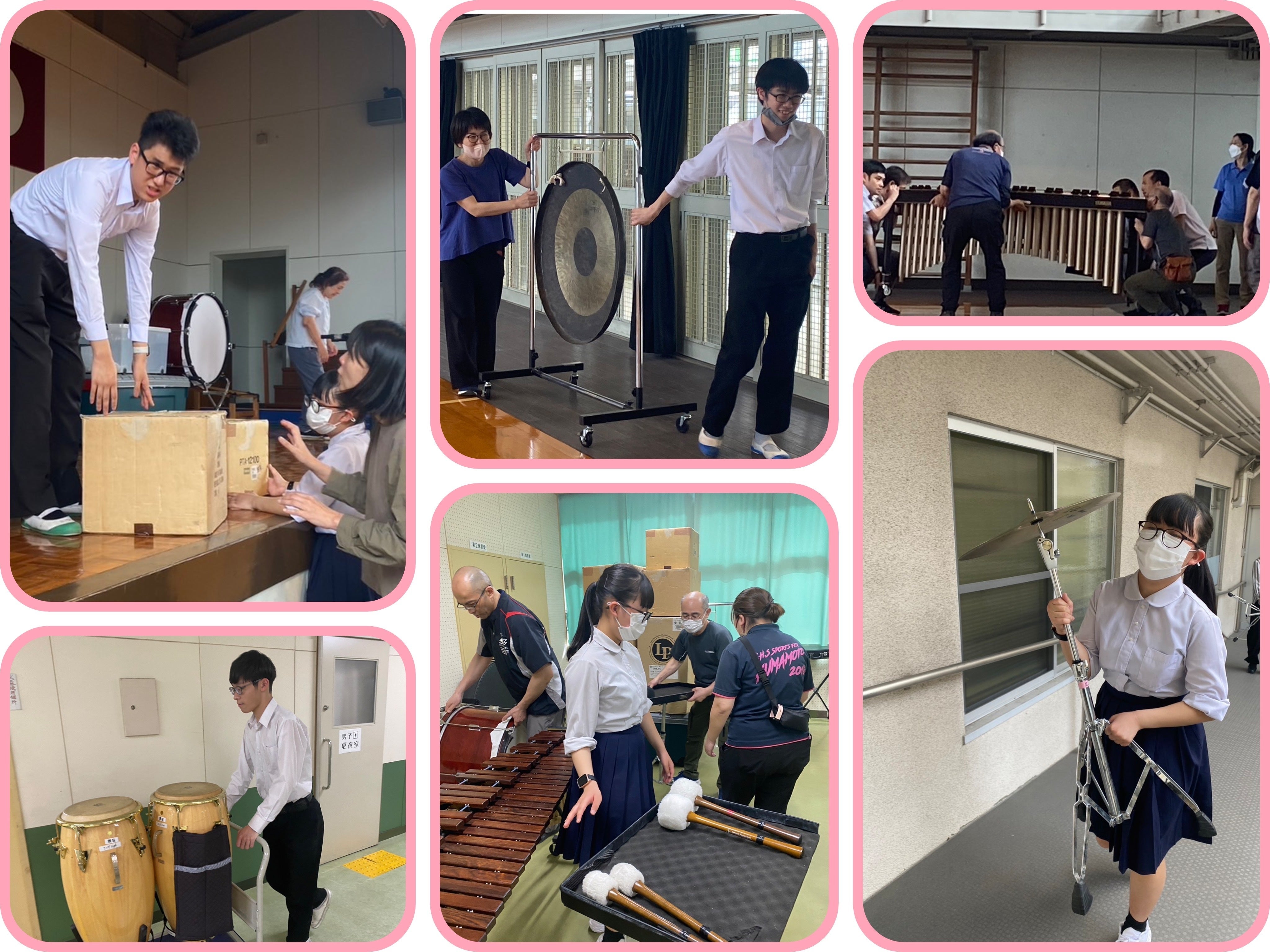 県総文に向け体育館での練習開始のための楽器移動を行いました。ステージ上の楽器配置を考えた練習が始まります。