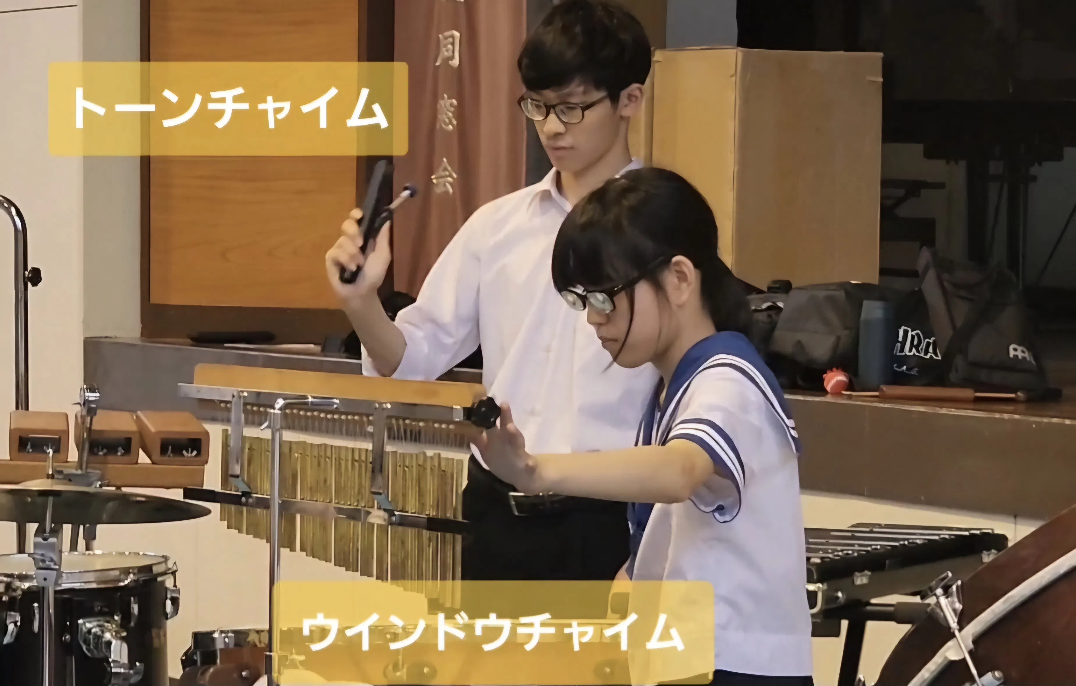 ウインドウチャイムを演奏する中学生部員は、静かに楽器の上部をたどり、鳴らし始める位置を確認して手をスタンバイ。