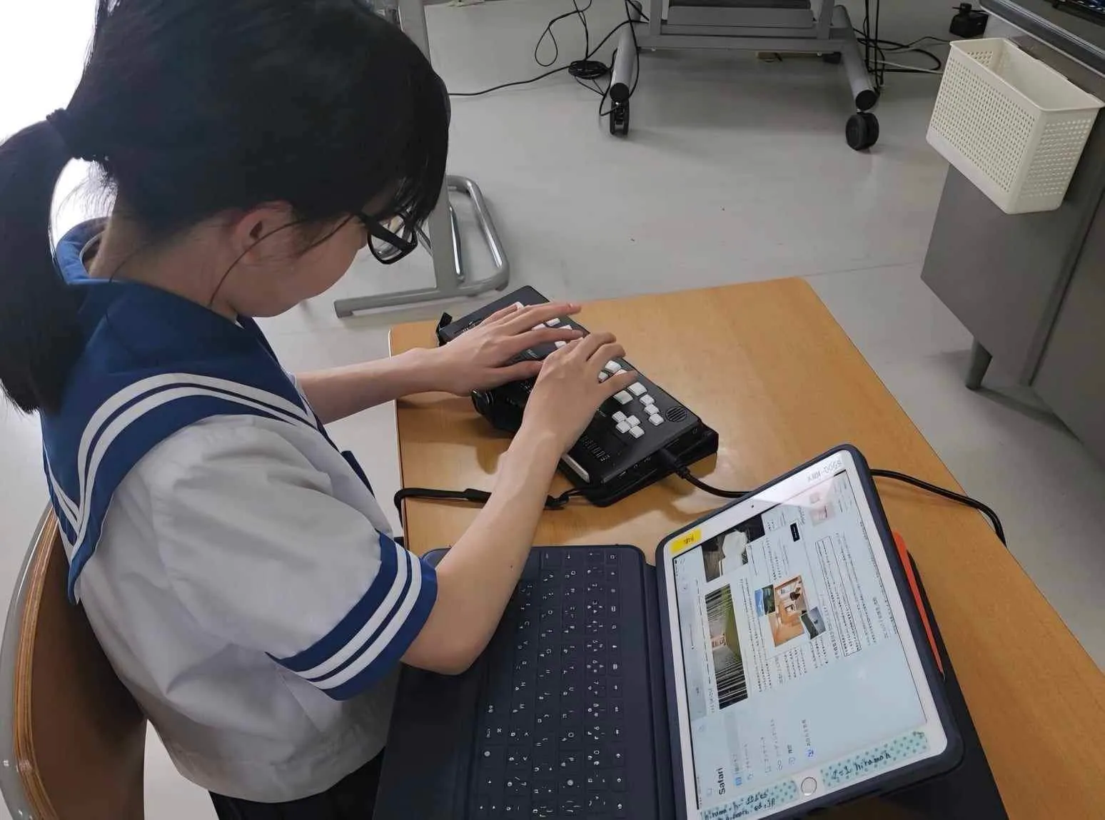 各種Androidアプリを点字で楽しむこともできます。点字だけでなく、テキストのデータ作成や編集も。それから音声読み上げ機能やボイスレコーダー機能、デイジー再生機能あったりと、点字使用者にとって学習や日常生活に欠かせないICT機器です。
