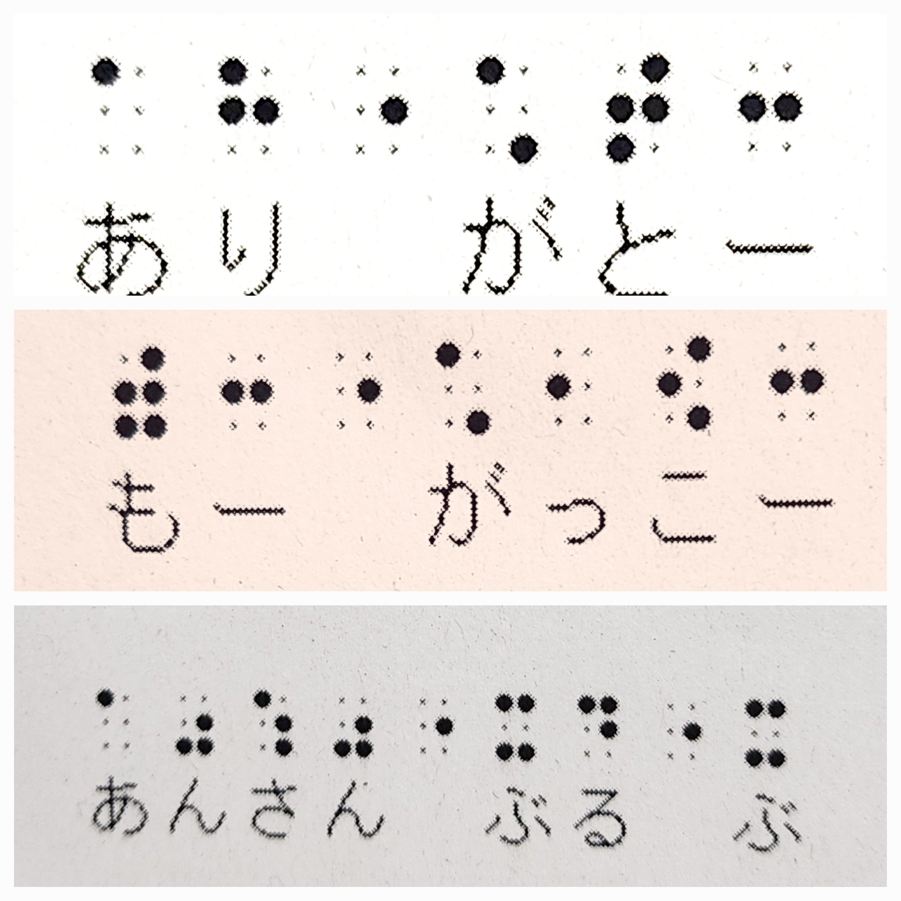 今回は点字について。名古屋ライトハウスのホームページより抜粋しました。「点字は、タテ3点・ヨコ2点の6点からなる表音文字です。読む側から見て、左上の点を「1の点」、下へ「2の点」「3の点」、右に移って上から「4の点」「5の点」「6の点」といいます。点字はすべて横書きで、左から右へ読みます。点字の50音は、母音を表す部分(1・2・4の点)と、子音を表す部分(3・5・6の点)によって構成されています。そして、この単位をマスと言います。ただし、ワ行はア行と同じ形を下の位置に下げ、ヤ行はこれに4の点を加えたものです。子音と母音の組み合わせの雰囲気はローマ字に近いといえます。」詳細は名古屋ライトハウスのホームページを読んでみてくださいね。点字五十音もどうぞ。