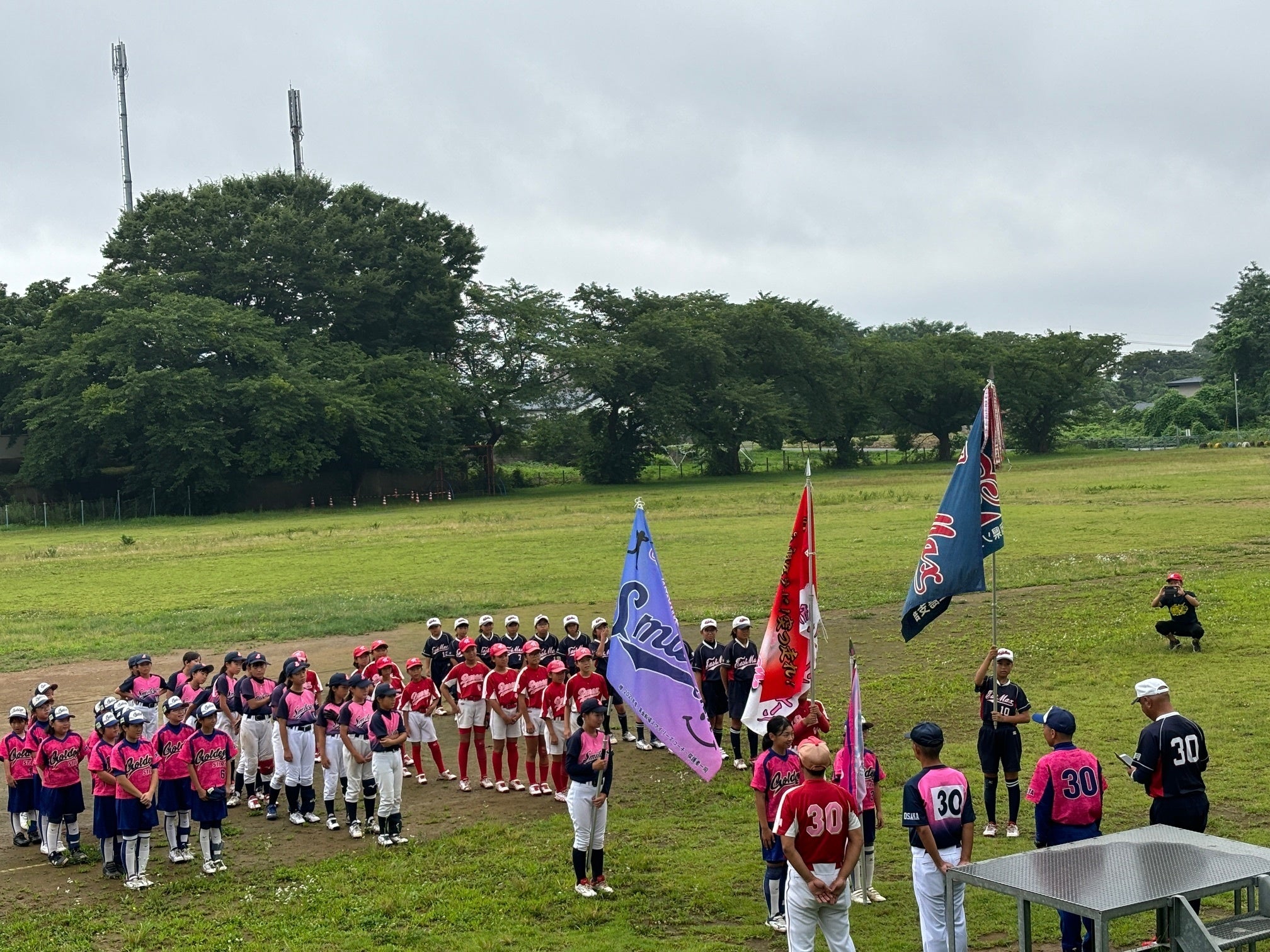 本来、大会の進行を務める能代ゴールデンのコーチが『只今より第38回全日本小学生女子ソフトボール大会を開催します』とアナウンスされた時には、こらえきれない思いがありました。本来は44チームでの開会式・・・。4チームだけど立派です!