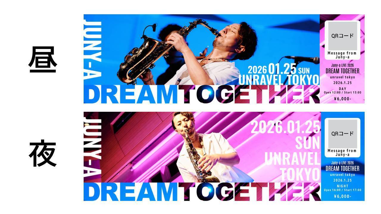 Juny-a LIVE2026"Dream Together"まで【9日】チケット受付URL https://eplus.jp/juny-a20260125/先日は配信ライブday1たくさん集まってくださり本当にありがとうございました!新春のめでたい感じで飛び交うスパチャ!!感謝しかありません!そして、来場者特典のメモリアルチケットのデザイン公開です!QR読み込んでもらえたら、ジュニアからのお礼のメッセージが届くというすんぽーです!ぜひ!どちらもゲットしてね!1月入ってからA studio+で幾田りらさん昨日はNHK the Coversで森崎ウィン君とテレビのオンエアも続きました!どちらもまだ見逃し配信みれるのでTVer、NHK ONEでそれぞれ楽しんでください!どちらもめちゃくちゃ素敵です。さて!着実に近づいております!わんまん!いよいよセトリも決まりみなさま楽しみにしているあの新曲や今回はみんな大好きあの曲が2026年バージョンにリアレンジしてそれがもう自分的にはかなぁりドキドキするかっこよさではやく聴いてもらいたい!!でも、その前に完成させなくちゃ!!(まだ途中。。)頑張ります!!去年の夏以降なんやかや現場に出ることが多く制作から遠のいていたのですが久々に制作するとやっぱり楽しい!!たくさん書いて今年も新曲たくさん届けますよ!おまちしてちます!!あと9日!!1/23(金)ジュニア一人配信ライブvol.65『ワンマンライブ直直前!!新春配信祭りday2すぺしゃる!!』 https://www.youtube.com/live/cnVyzZQ4-A4?si=ACYUqtVI90J5O0fH 2026年1月25日(日)Juny-a ワンマンライブDream Together六本木unravel tokyohttps://junyasax.com/live2026dreamtogether/