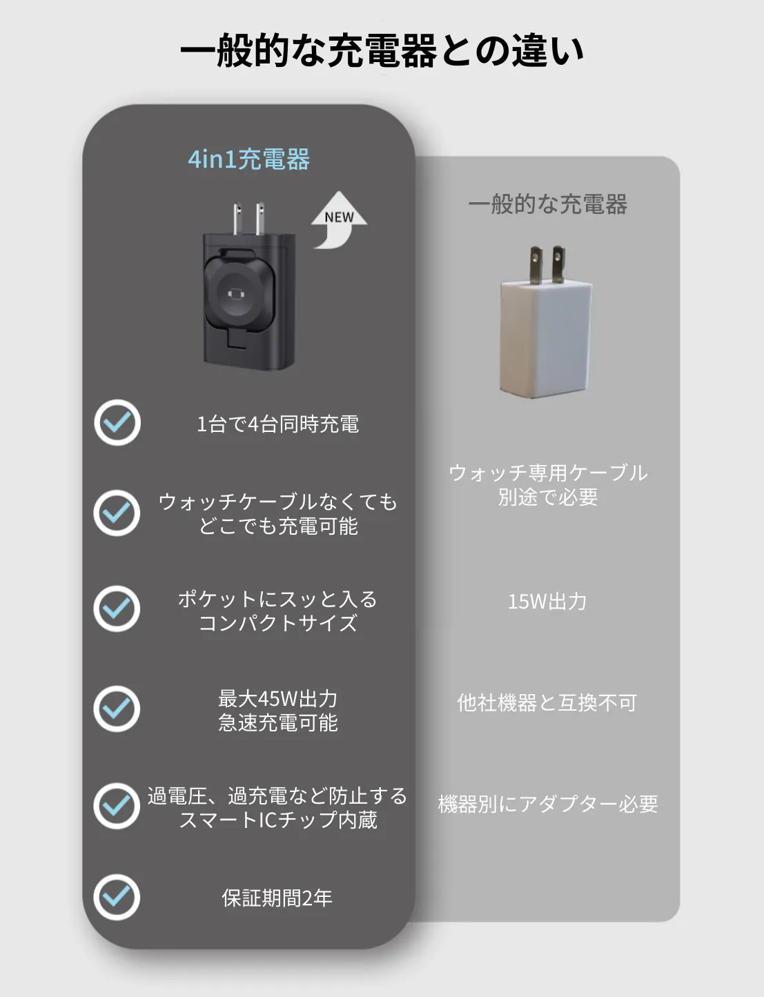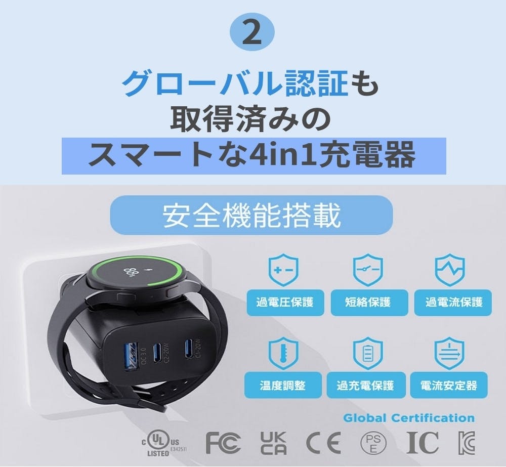 「4in1充電器」は、3つのポートとウォッチ充電部の4つの充電機能があり、スマホやイヤホン、タブレットを充電ながら、ウォッチの充電も専用ケーブルなく充電できます。