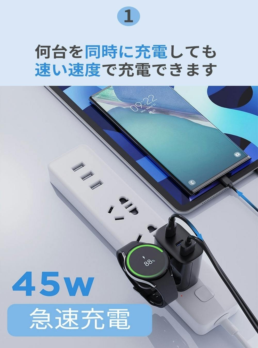 最大45Wまで出力するアダプターで、USB-Cポートは最大20W出力するので、スマホの急速充電をしながらウォッチやイヤホンの充電もできます。