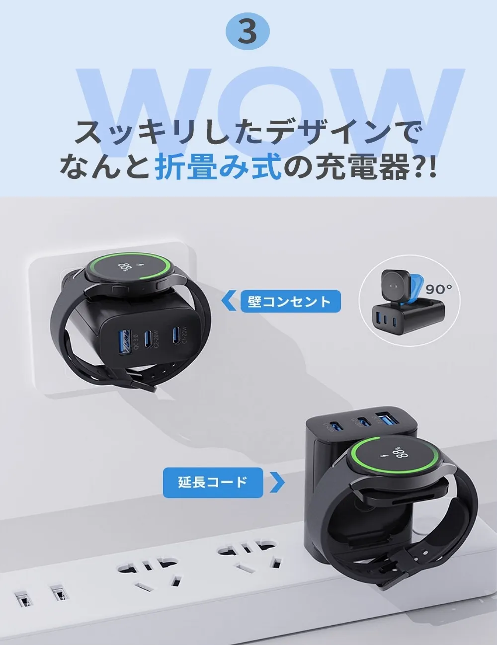 ウォッチ充電部は折り畳み式で壁のコンセントに挿したり、延長コードに挿したりしても、ウォッチ充電を使用することができます。