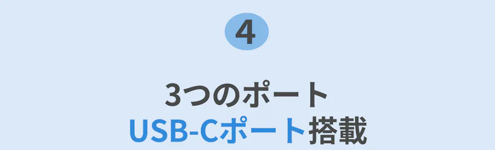 USB-Cポート2つとUSB-Aポートで、ケーブルを3つ挿すことができるので、コンセントが充電アダプターで占領されることがなくなります。