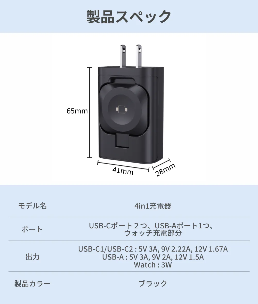 4in1充電器はアダプターに3つのポートがあり、コンセントを占領することなく同時に充電できます。スマートウォッチは充電ケーブルを別で用意しなくても充電できます。