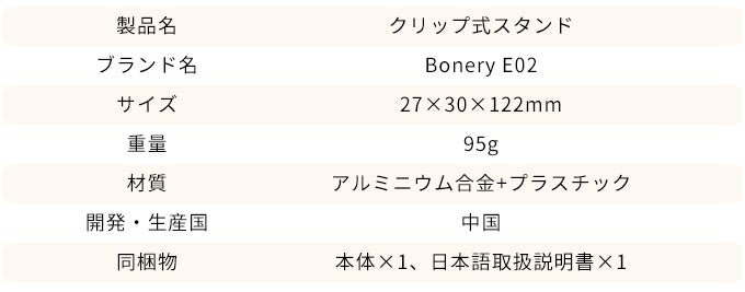 工具や面倒なネジは一切使用せず、挟む場所さえあれば簡単に装着可能クリップ式スタンド「Bonery E02」。
