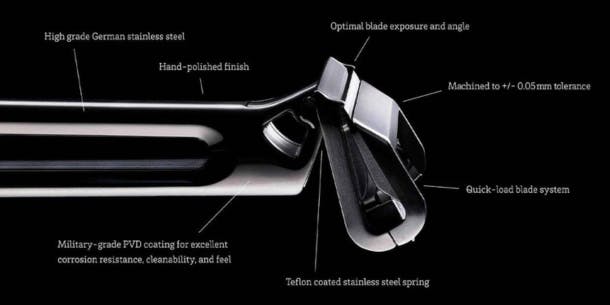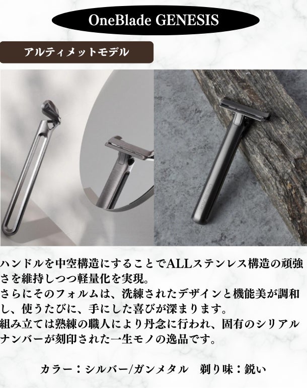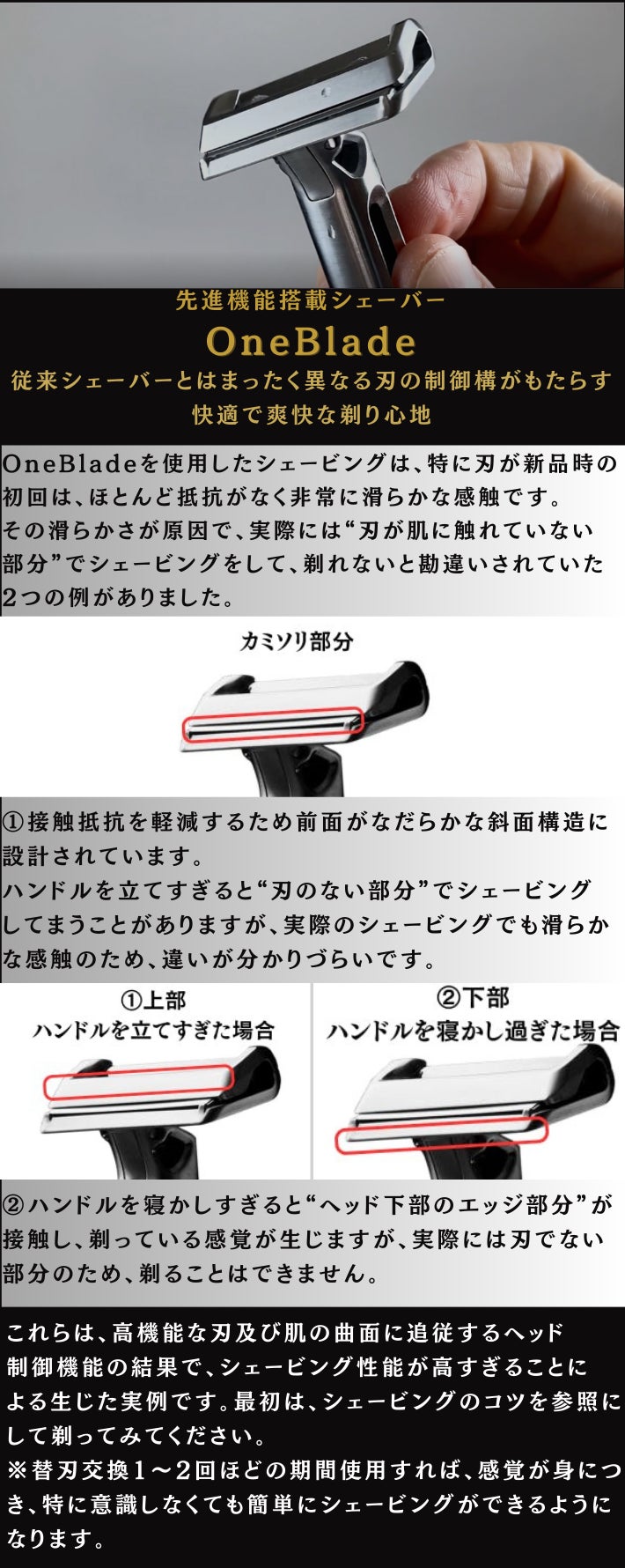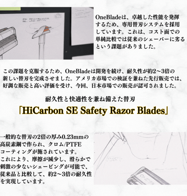 社名である“ONEBLADE”の由来は、大手カミソリメーカーが「複数刃競争」に続々と参入し、刃の数を増やすことが一般的だった流れの中で、精密に作られた高機能シェーバーと機能が優れたカミソリの刃があれば、1枚の刃でも確実に剃ることができ、むしろ肌にも優しいということに確信を得たからです。