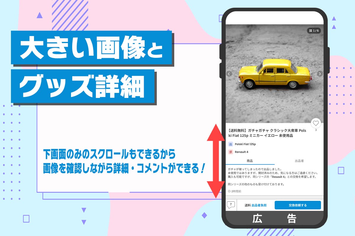 スクロールの大きさによって画像を表示したままグッズの商品詳細を確認できます。