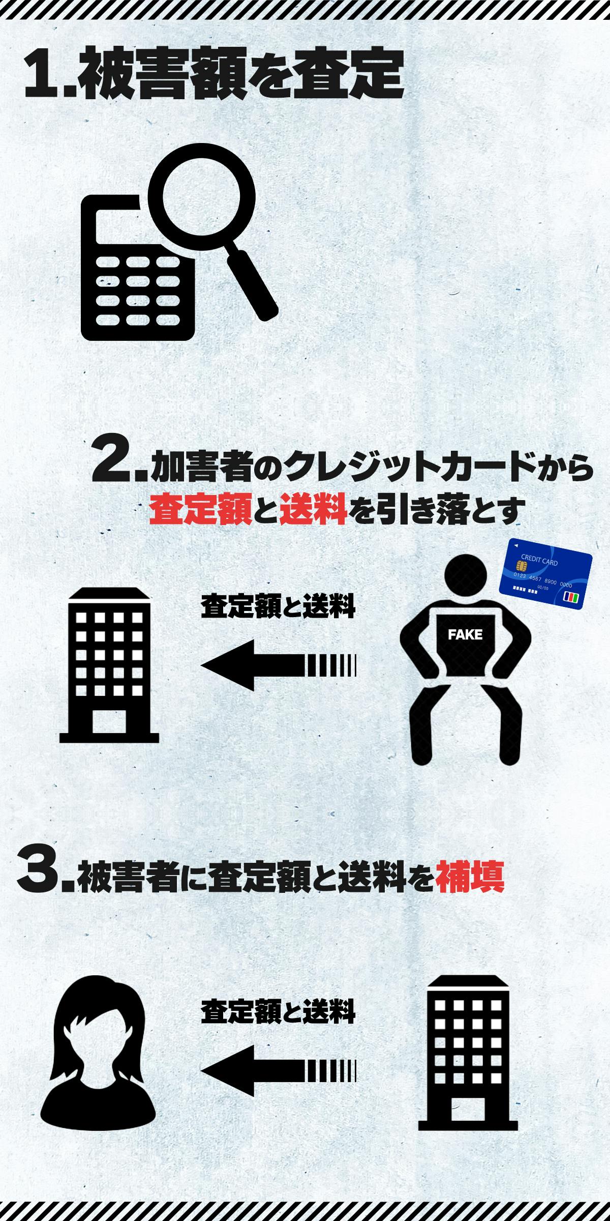 不正を働いた際、被害者に対して物品の鑑定額と送料を加害者のクレジットカードから補填として引き落とします。
