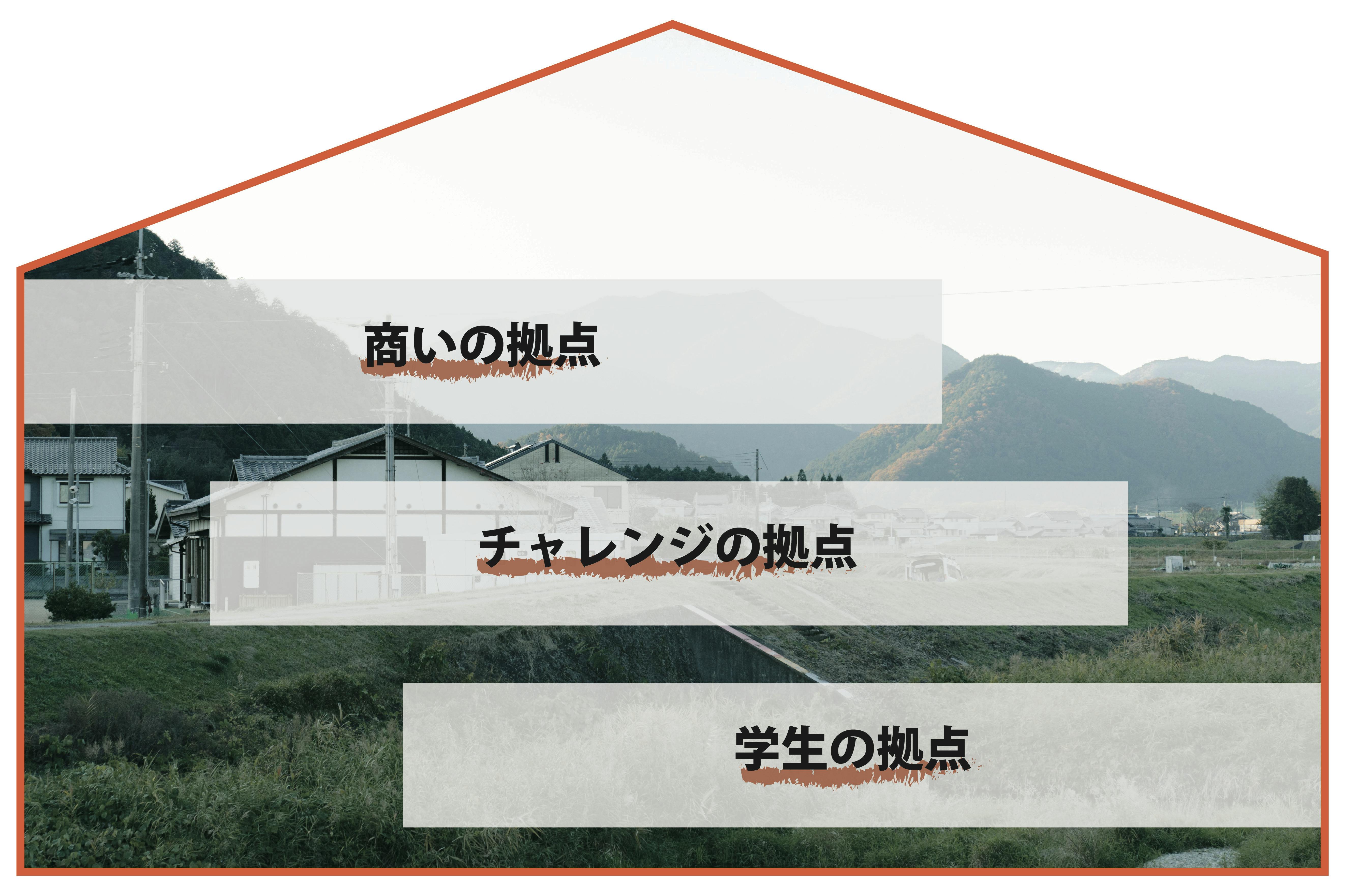 1.商いの拠点 2.チャレンジの拠点 3.学生の拠点 の3本柱を指針にしながら、地域の空き家について実践を通して考えています。