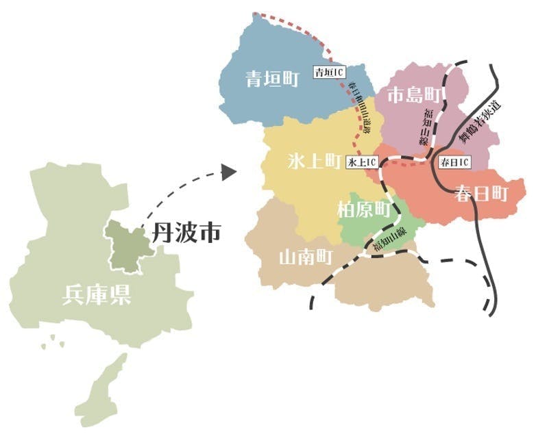丹波市氷上町は兵庫県の中心部に位置し、山に囲まれ佐治川が流れる自然豊かな地域です。