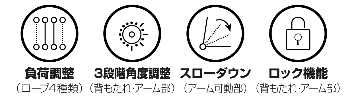 負荷や角度調整(3段階)、スローダウンやロック機能付き。複雑な組立は一切なく、すぐに使えて高齢者や子供でも心地良くトレーニングが可能です。