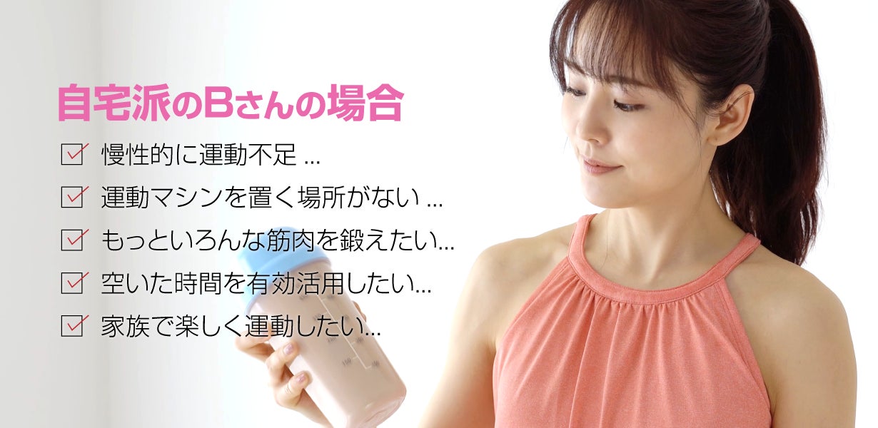 自宅がトレーニングジム。家事や仕事の合間などいつでも手軽に始めることが、効果的な運動習慣をつける秘訣です。※運動習慣者:1回30分以上の運動を、週2回以上実施し、1年以上持続している人(厚生労働省サイト参照)